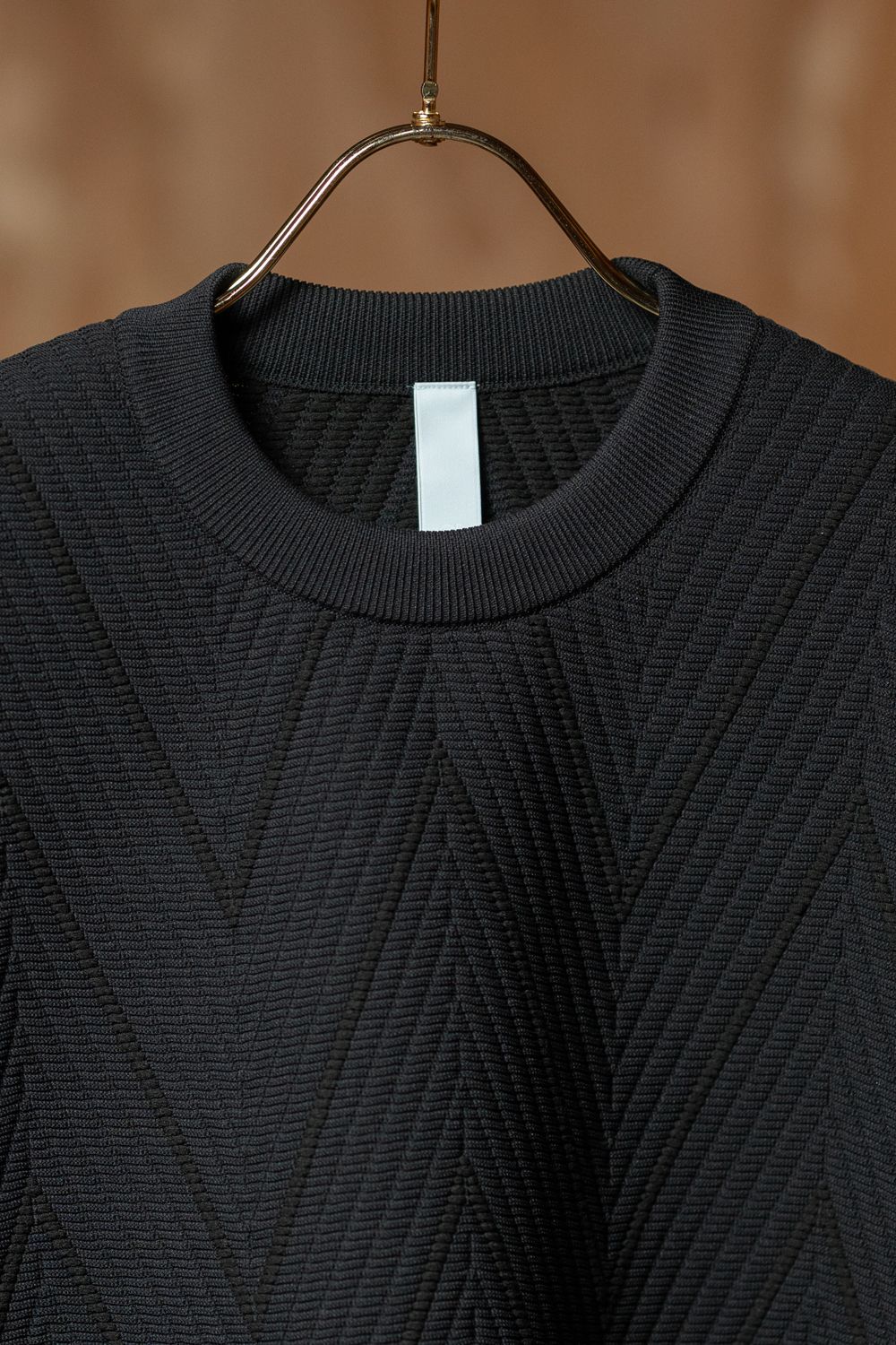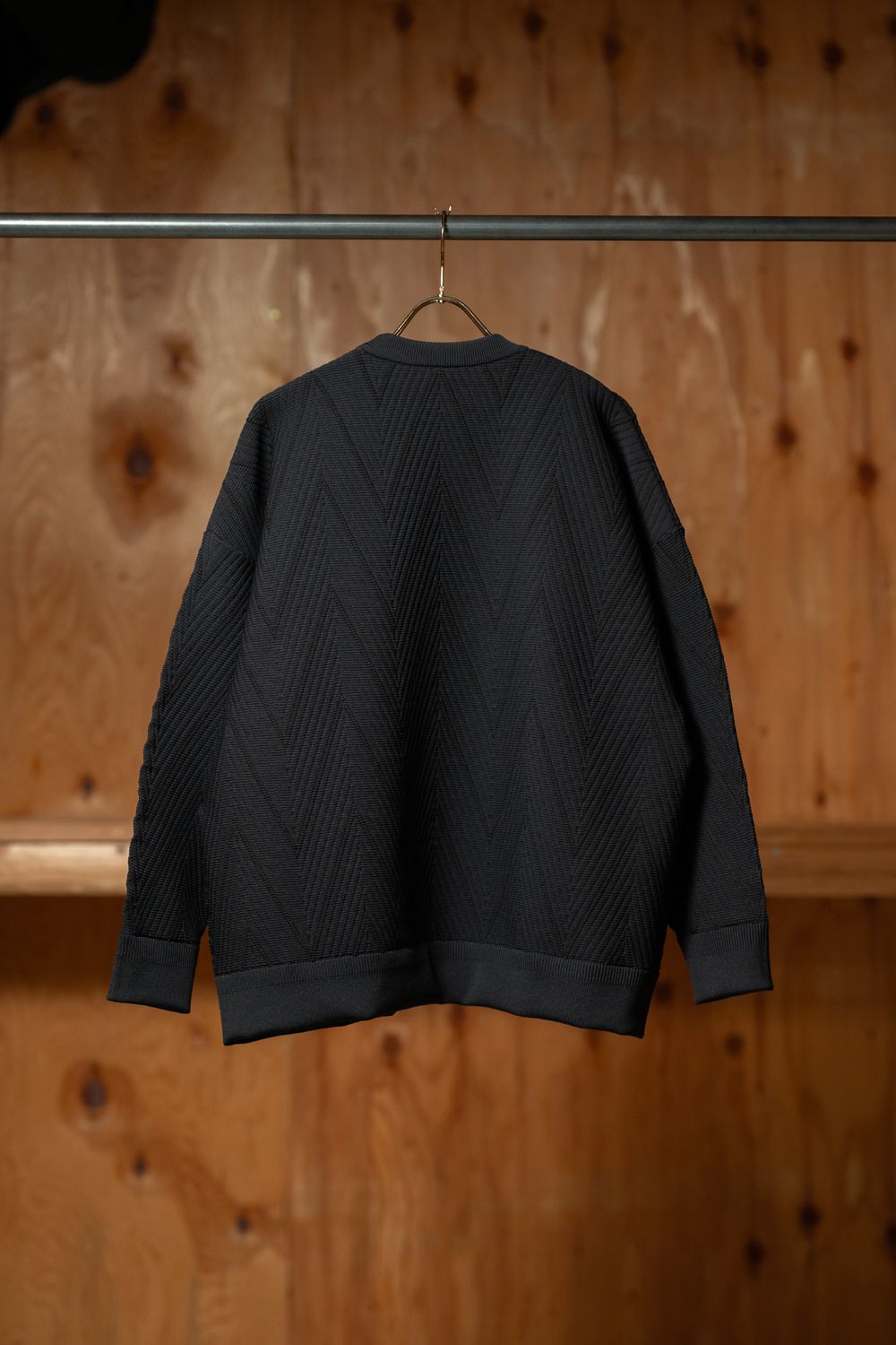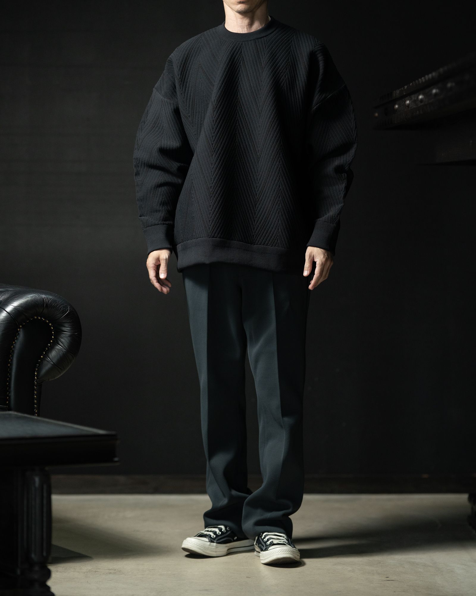 大胆なヘリンボーン柄のプルオーバー。袖口と裾には2種類のリブ編みを組み合わせて立体感をプラスし、ゆったりとしたシルエットが現代的な印象を演出します。