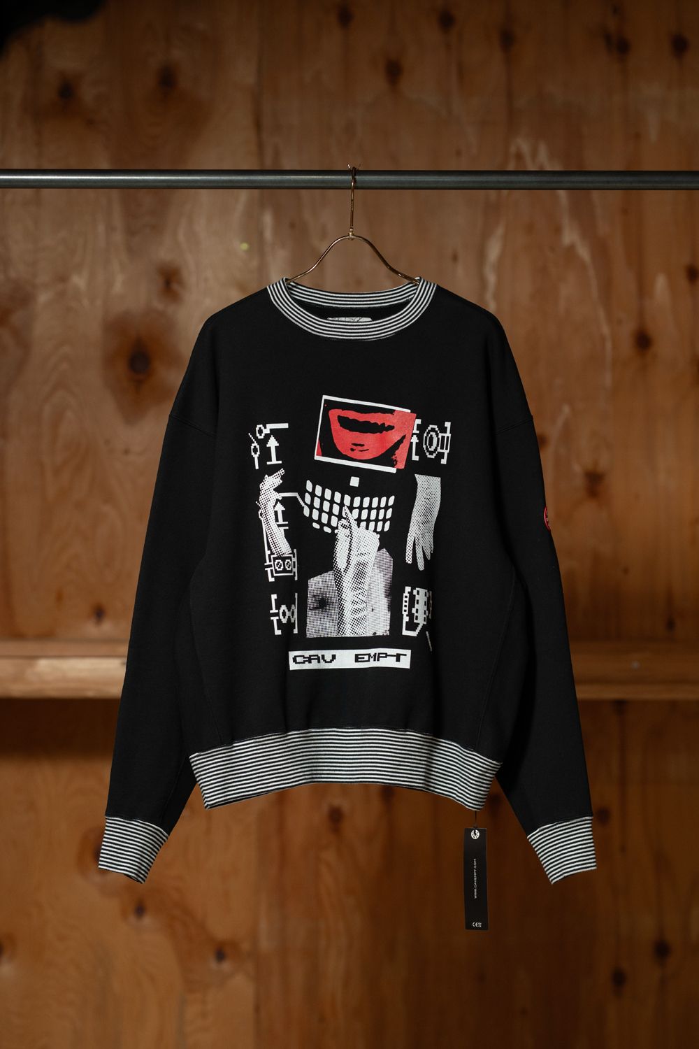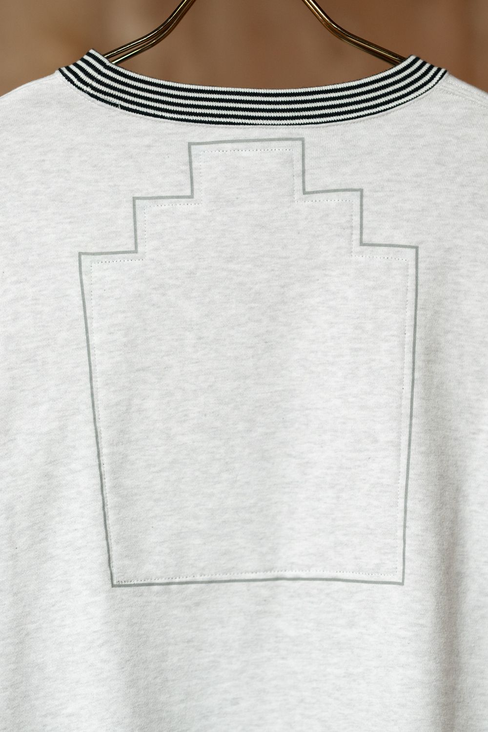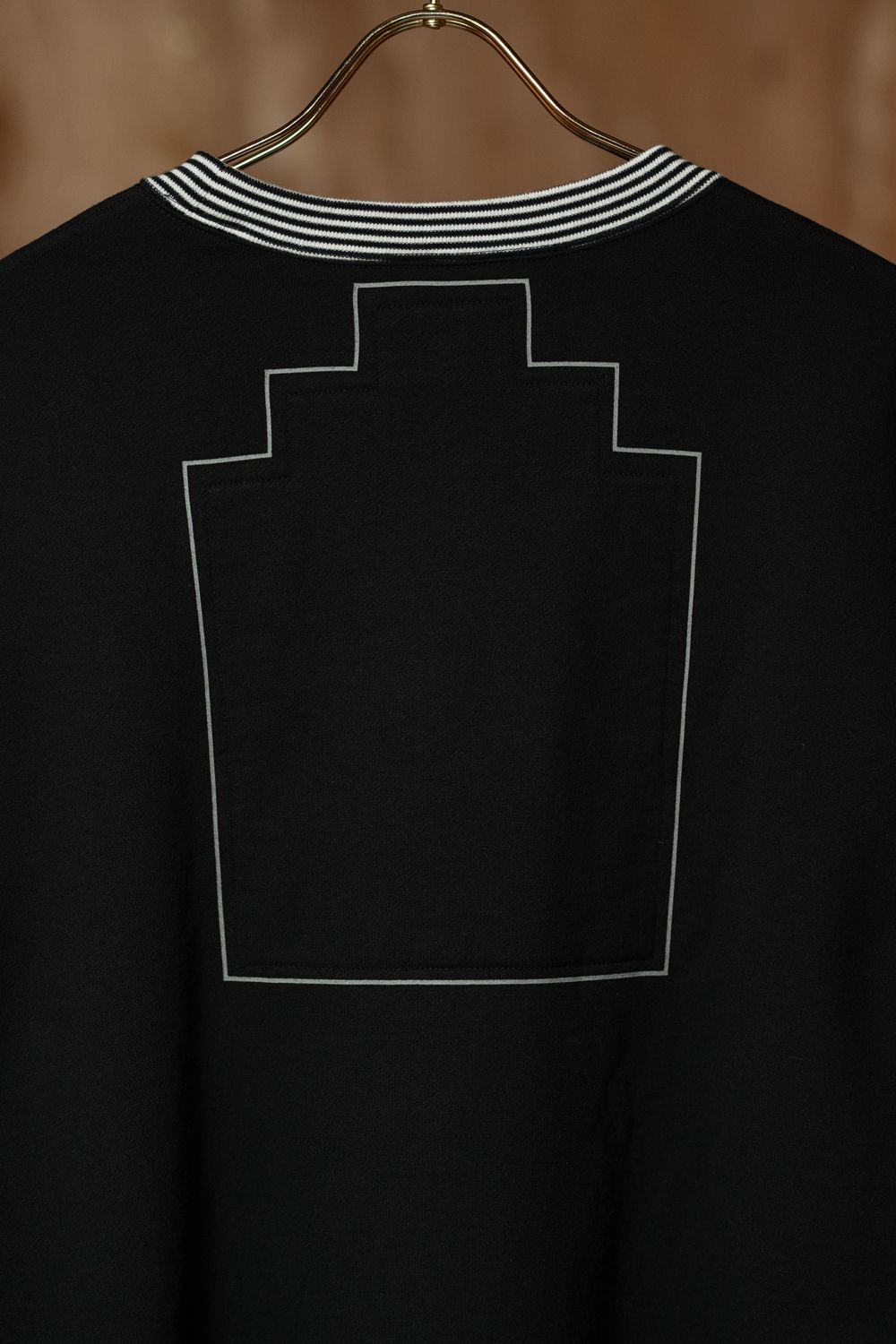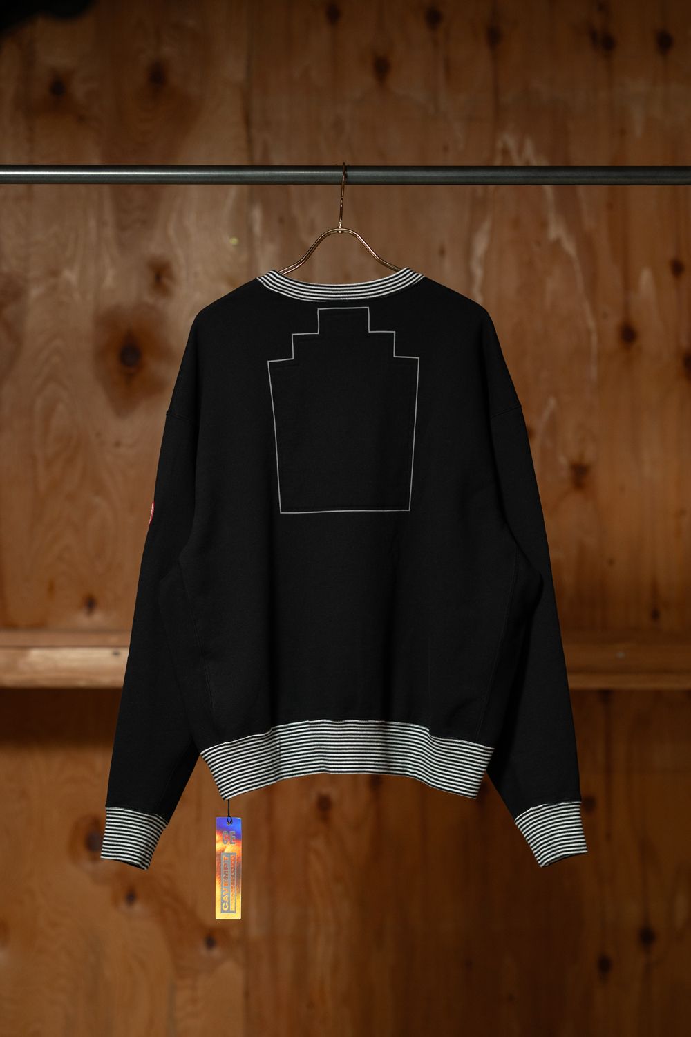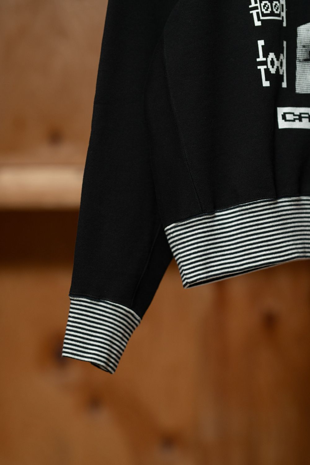 100%コットン。スウェット生地。プルオーバー。クルーネック。セットインスリーブ。前身頃にグラフィック。後ろ身頃裏に布パッチ。後ろ身頃表にリフレクタープリント。左袖上部にシリコンパッチ。襟、袖口、裾にストライプリブ。袖下、脇で生地切り替え。ワイドシルエット。ウォッシュ加工。ブラック、グレーの2色展開。日本製。