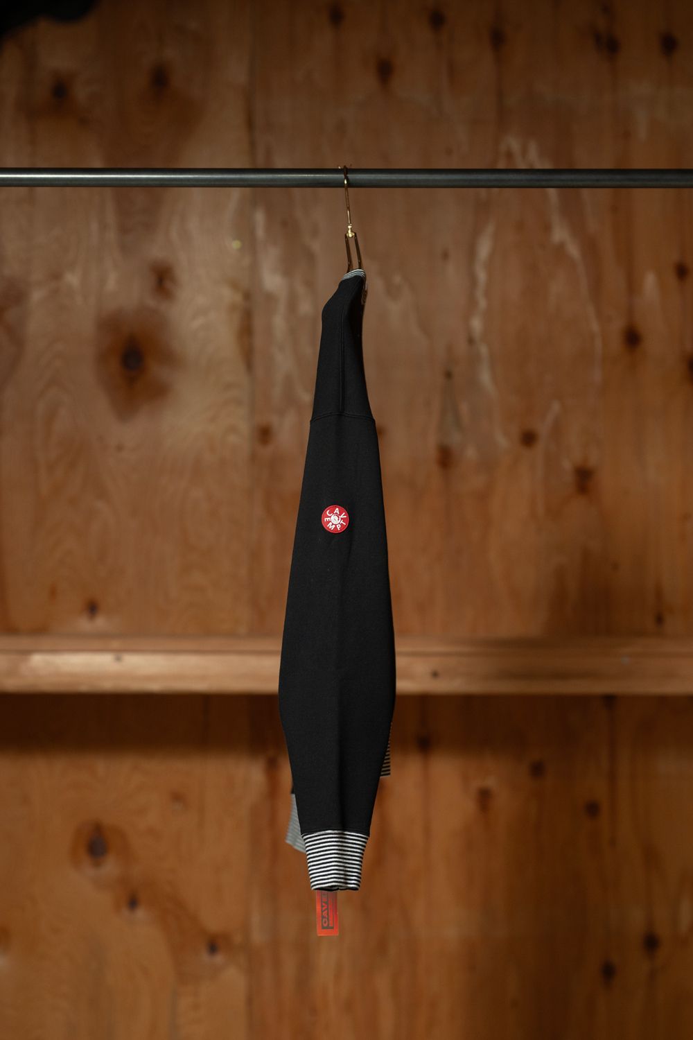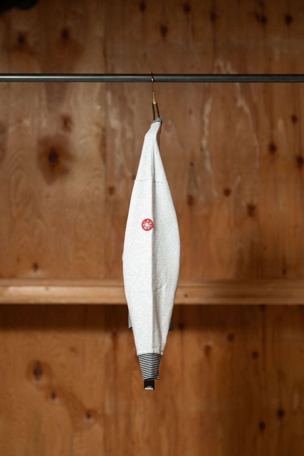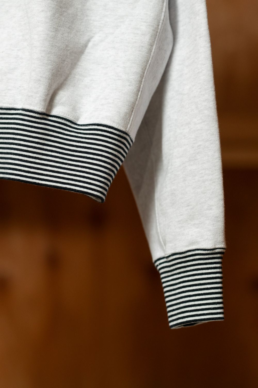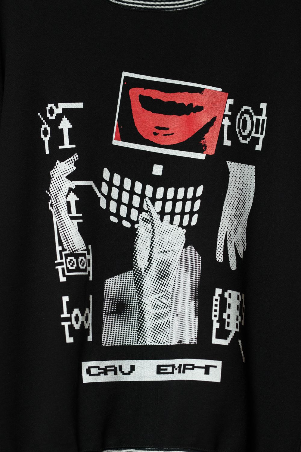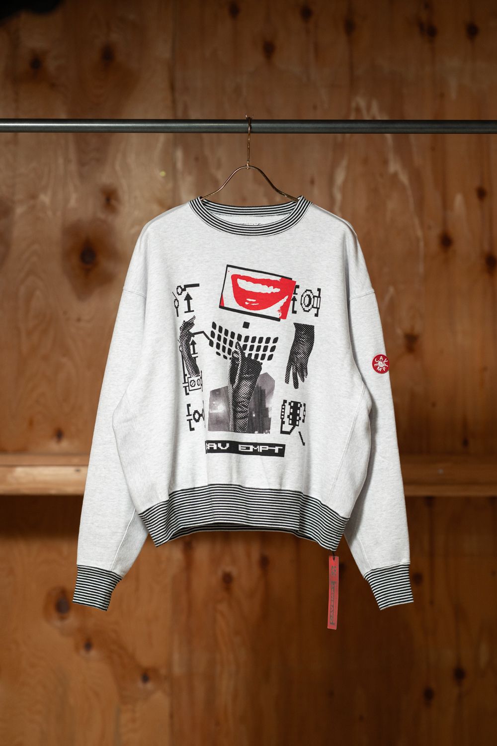 100%コットン。スウェット生地。プルオーバー。クルーネック。セットインスリーブ。前身頃にグラフィック。後ろ身頃裏に布パッチ。後ろ身頃表にリフレクタープリント。左袖上部にシリコンパッチ。襟、袖口、裾にストライプリブ。袖下、脇で生地切り替え。ワイドシルエット。ウォッシュ加工。ブラック、グレーの2色展開。日本製。