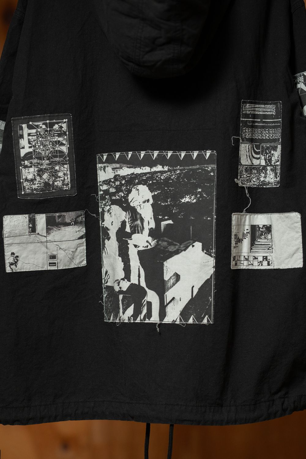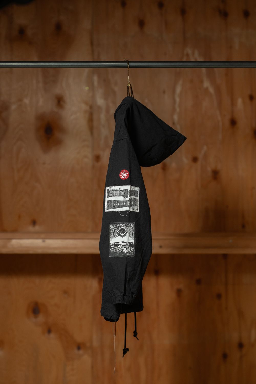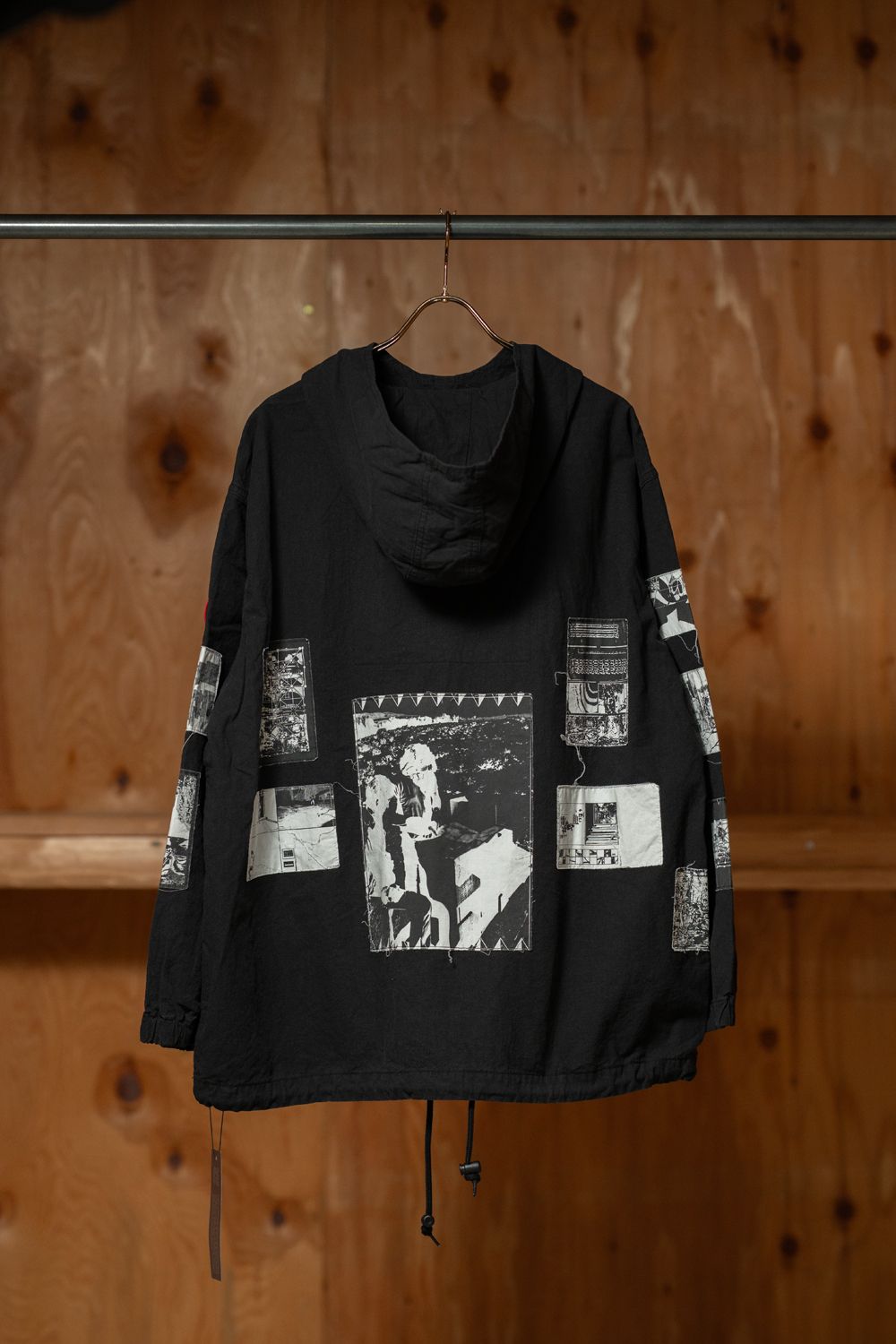 55%リネン。45%コットン。キャンバス生地。プルオーバー。セットインスリーブ。前身頃、後ろ身頃表、後ろ身頃裏、袖にパッチ。左袖上部にシリコンパッチ。前身頃にウェルトポケット。裾にドローストリング。袖口にゴム。バイオウォッシュ加工。日本製。