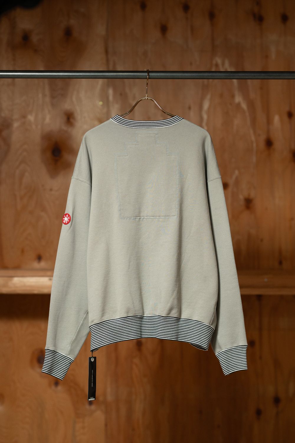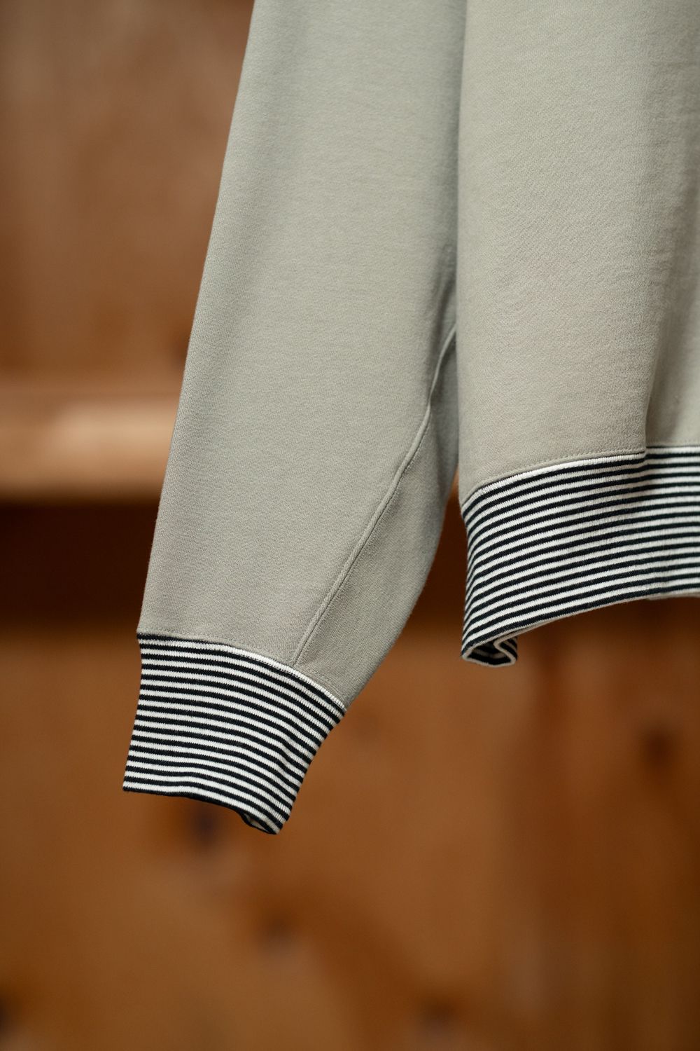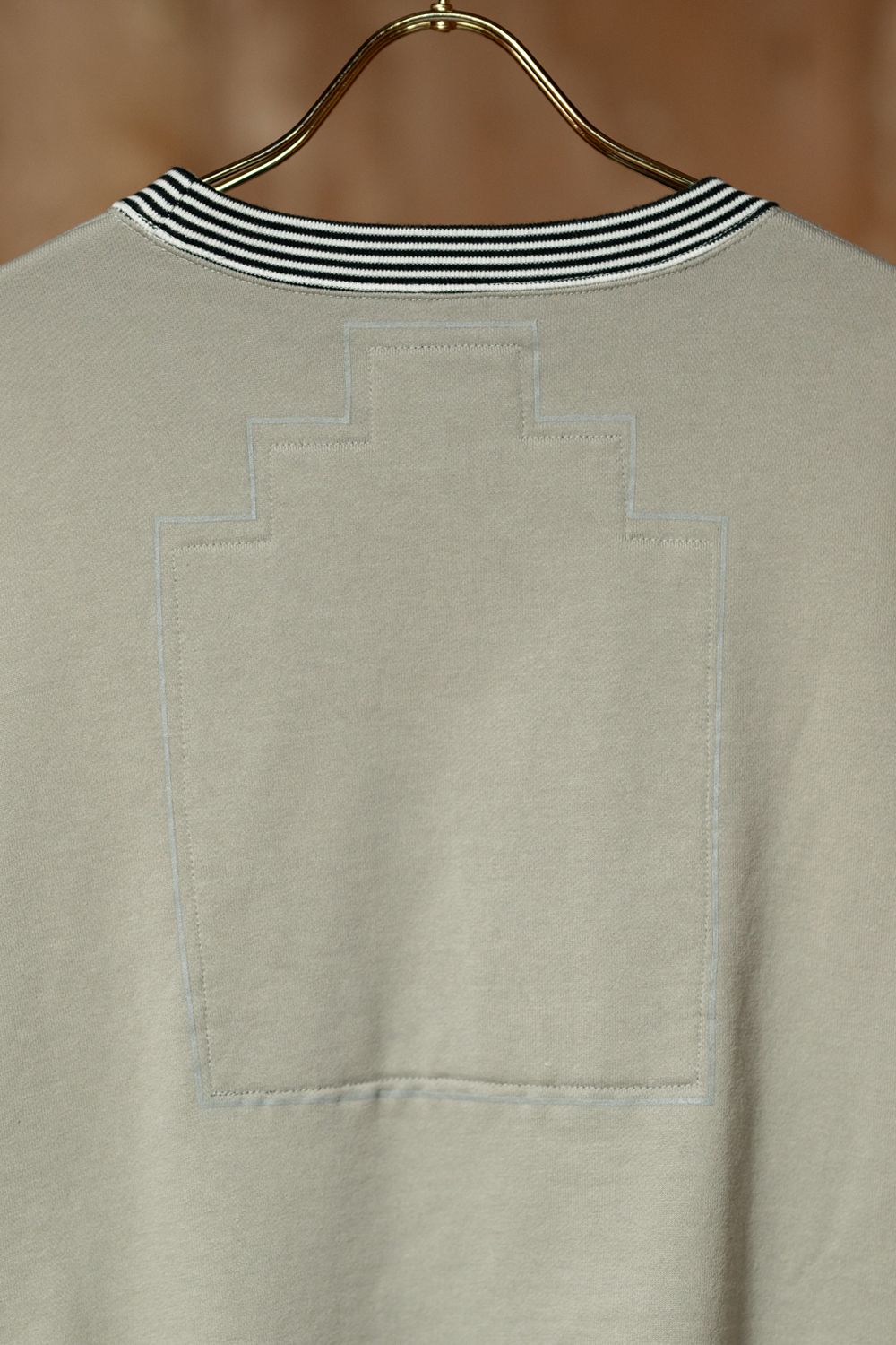 100%コットン。スウェット生地。プルオーバー。クルーネック。セットインスリーブ。後ろ身頃裏に布パッチ。後ろ身頃表にリフレクタープリント。左袖上部にシリコンパッチ。襟、袖口、裾にストライプリブ。袖下、脇で生地切り替え。ワイドシルエット。ウォッシュ加工。日本製。