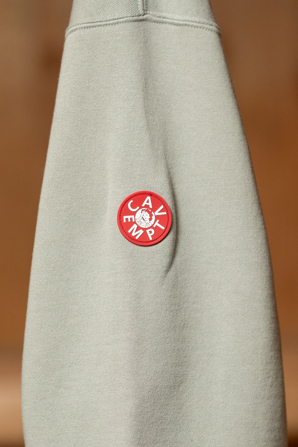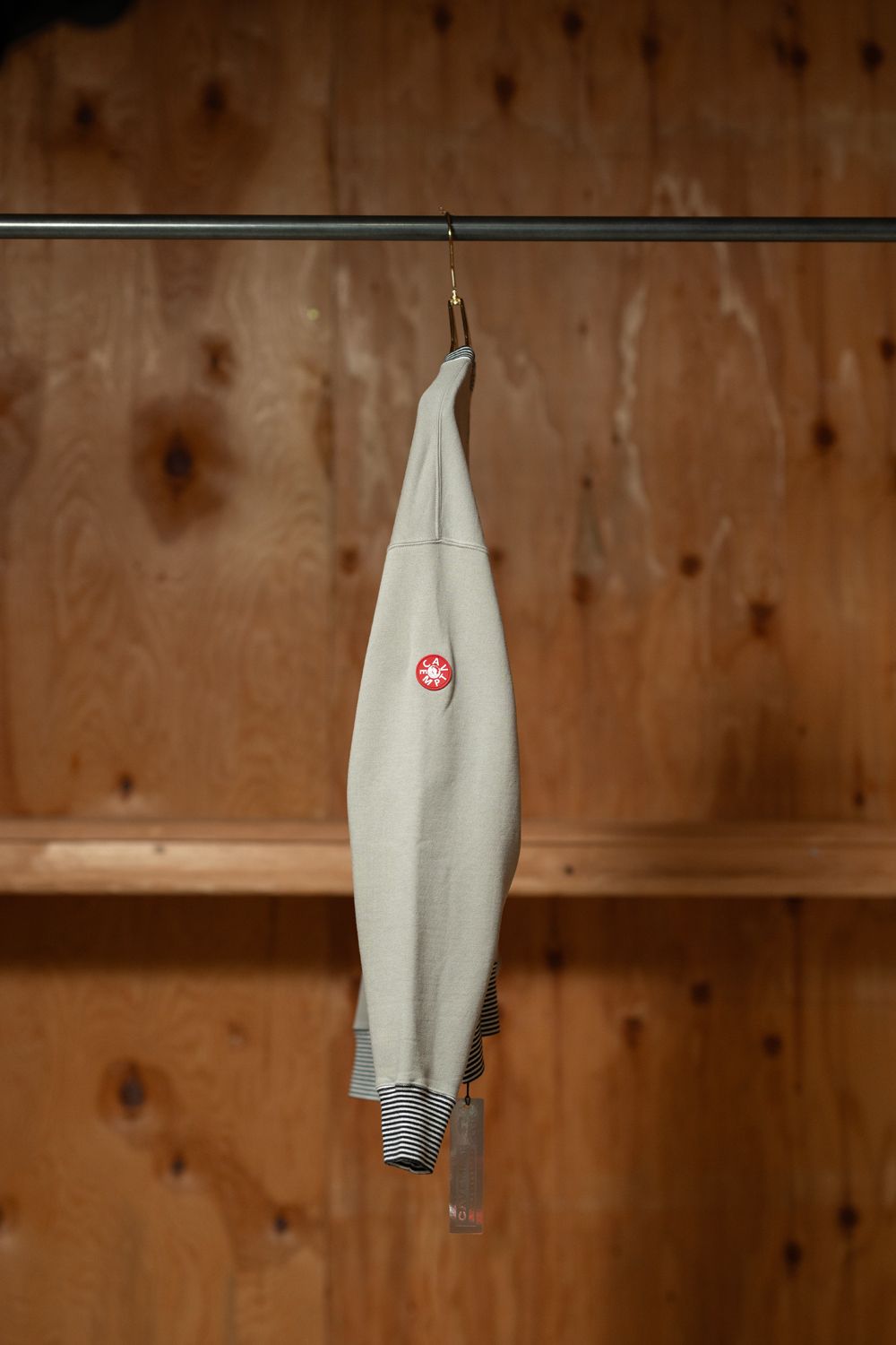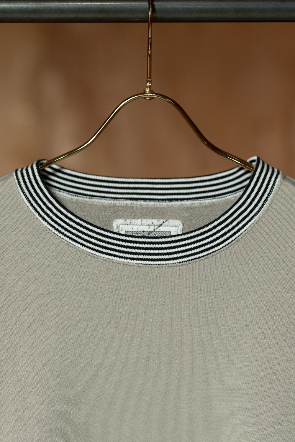 100%コットン。スウェット生地。プルオーバー。クルーネック。セットインスリーブ。後ろ身頃裏に布パッチ。後ろ身頃表にリフレクタープリント。左袖上部にシリコンパッチ。襟、袖口、裾にストライプリブ。袖下、脇で生地切り替え。ワイドシルエット。ウォッシュ加工。日本製。