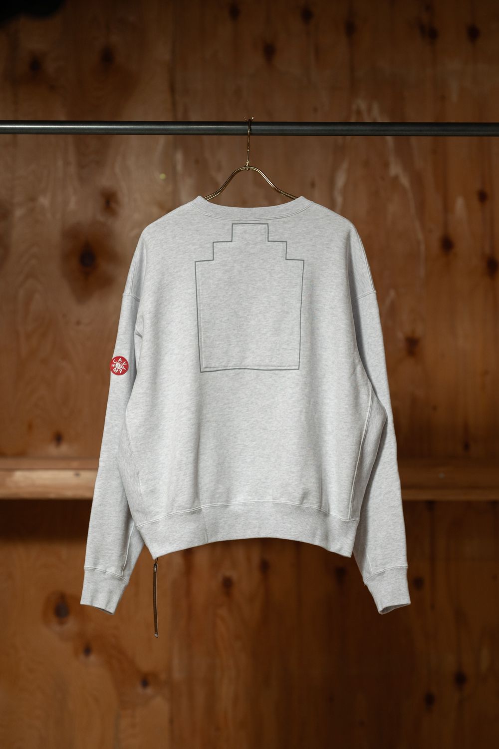 100%コットン。スウェット生地。プルオーバー。クルーネック。セットインスリーブ。前身頃にグラフィック。後ろ身頃裏に布パッチ。後ろ身頃表にリフレクタープリント。左袖上部にシリコンパッチ。袖下、脇で生地切り替え。ワイドシルエット。ウォッシュ加工。日本製。