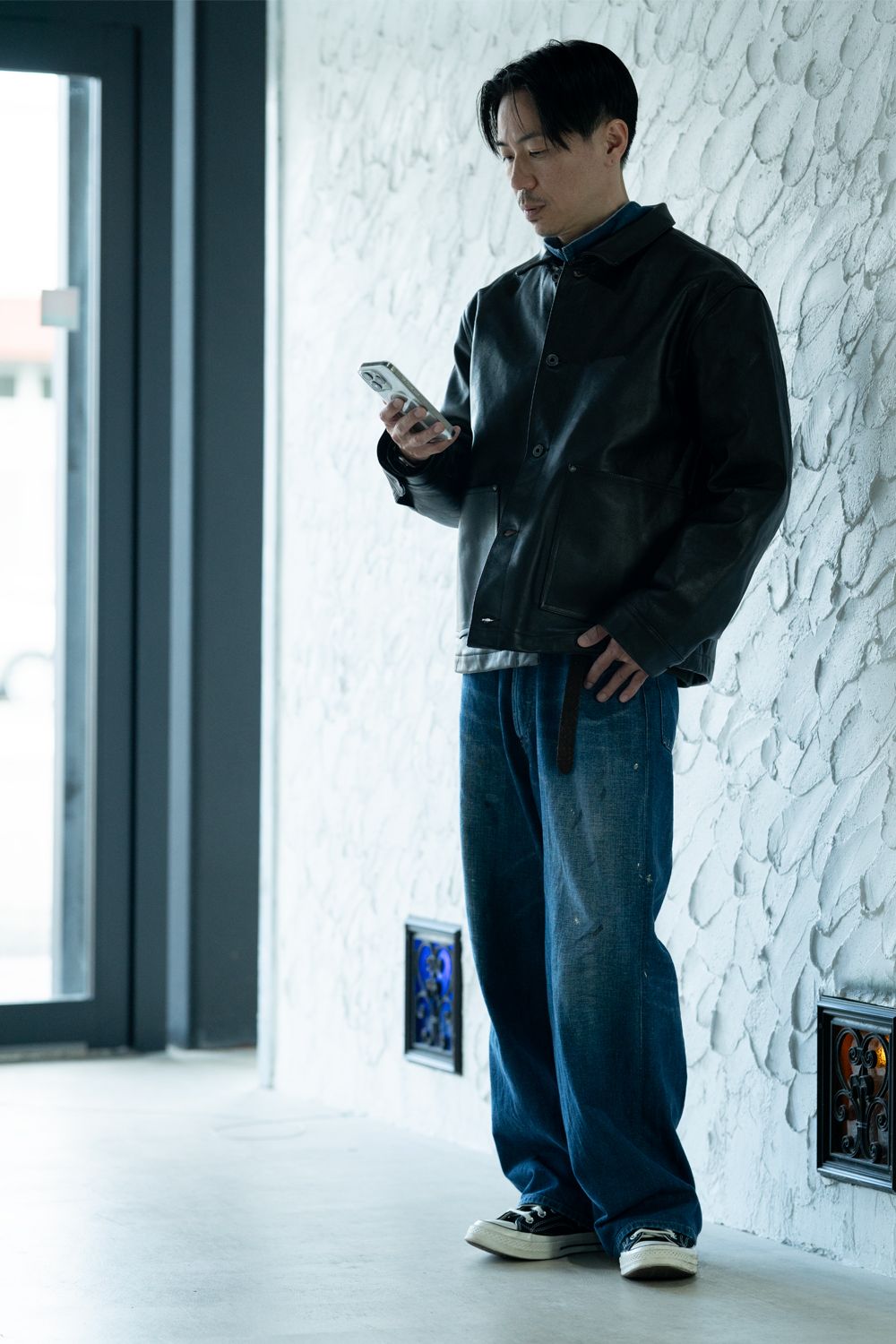 Lot.303 を馬革で作成したレザージャケット。AW25 では、軽量な一枚仕立てから秋冬向けに裏地付きに仕様を変更している。裏地にはLot.116 Long-Point Collar Sports Shirts に使用しているウール / リネン生地を使用。