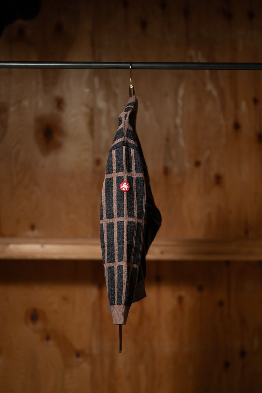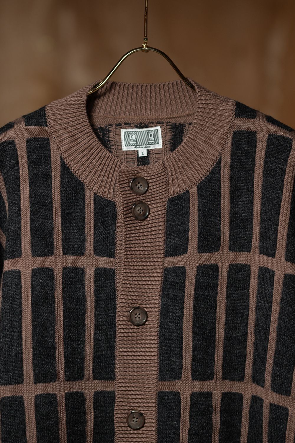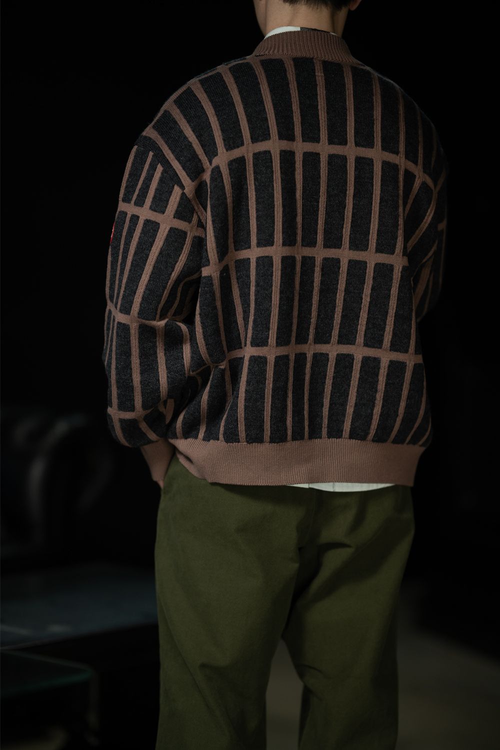 50%ウール、50%コットン。ジャカード編みニット。モックネック。ボタンアップ。セットインスリーブ。左袖上部にシリコンパッチ。ワイドシルエット。日本製。