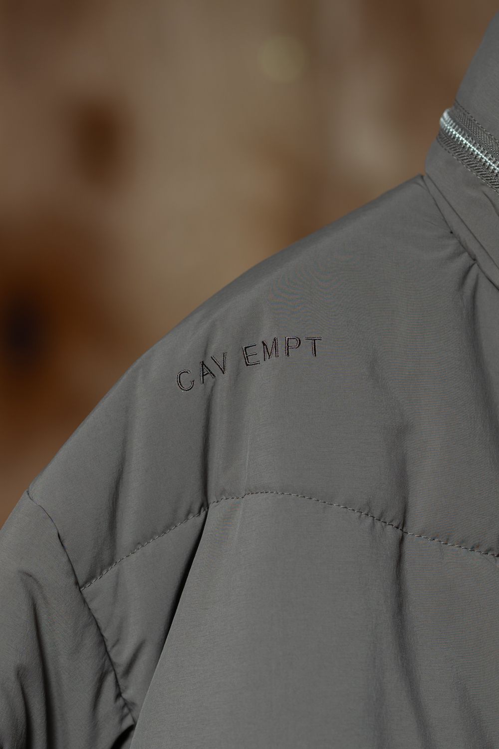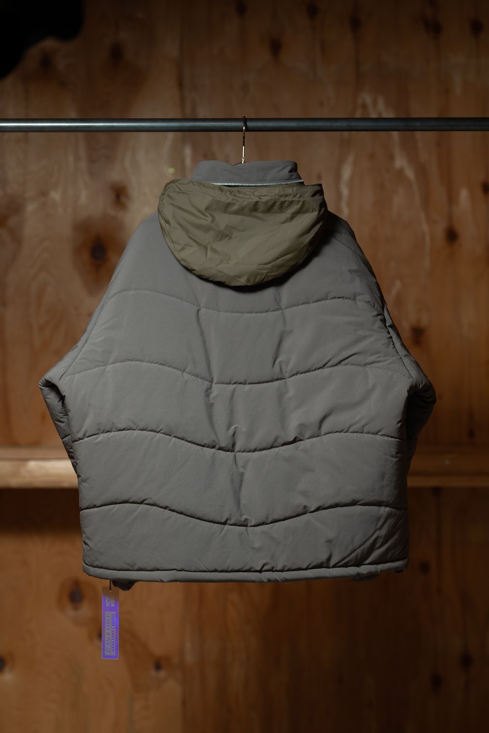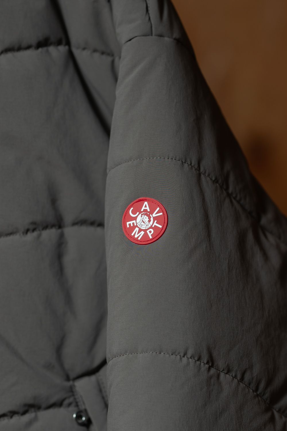 表地、裏地、シンサレート中綿、100%ポリエステル。ジップアップ。比翼フラップ。セットインリーブ。前身頃両ショルダーに刺繍でCAVEMPT。左袖上部にシリコンパッチ。前身頃にウェルトポケット。前身頃裏にスライドファスナーポケット。襟に収納式フード。フード、裾にドローストリング。袖口にゴム。ワイドシルエット。日本製。