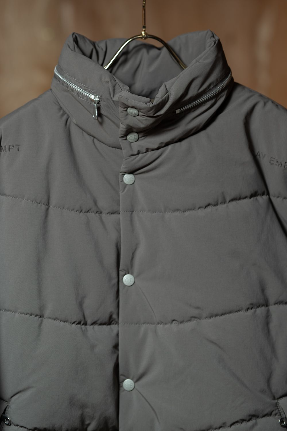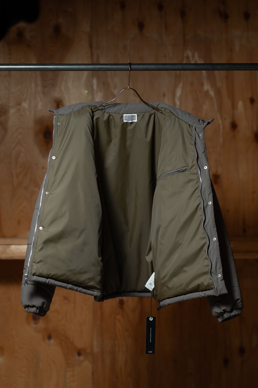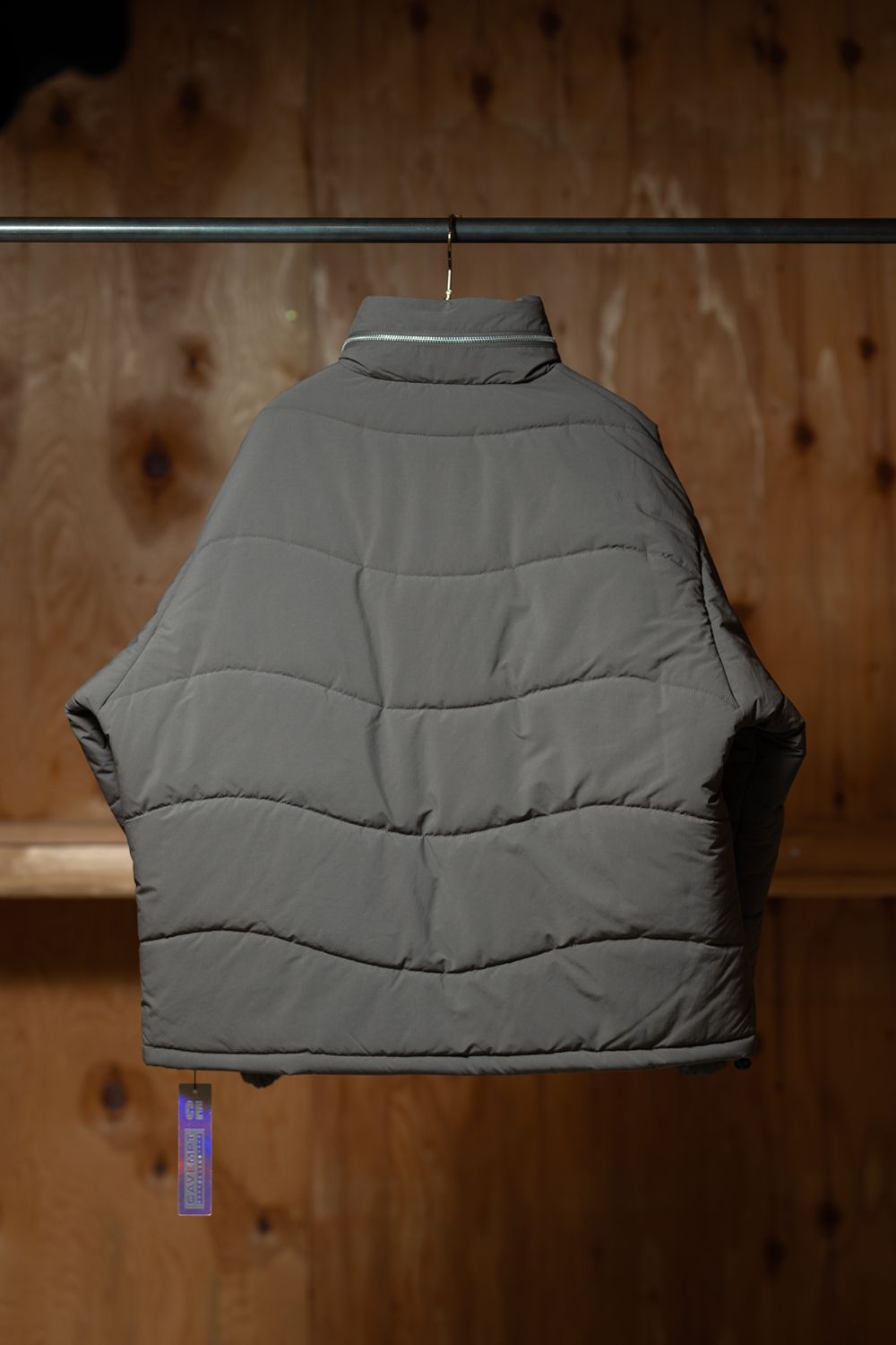 表地、裏地、シンサレート中綿、100%ポリエステル。ジップアップ。比翼フラップ。セットインリーブ。前身頃両ショルダーに刺繍でCAVEMPT。左袖上部にシリコンパッチ。前身頃にウェルトポケット。前身頃裏にスライドファスナーポケット。襟に収納式フード。フード、裾にドローストリング。袖口にゴム。ワイドシルエット。日本製。