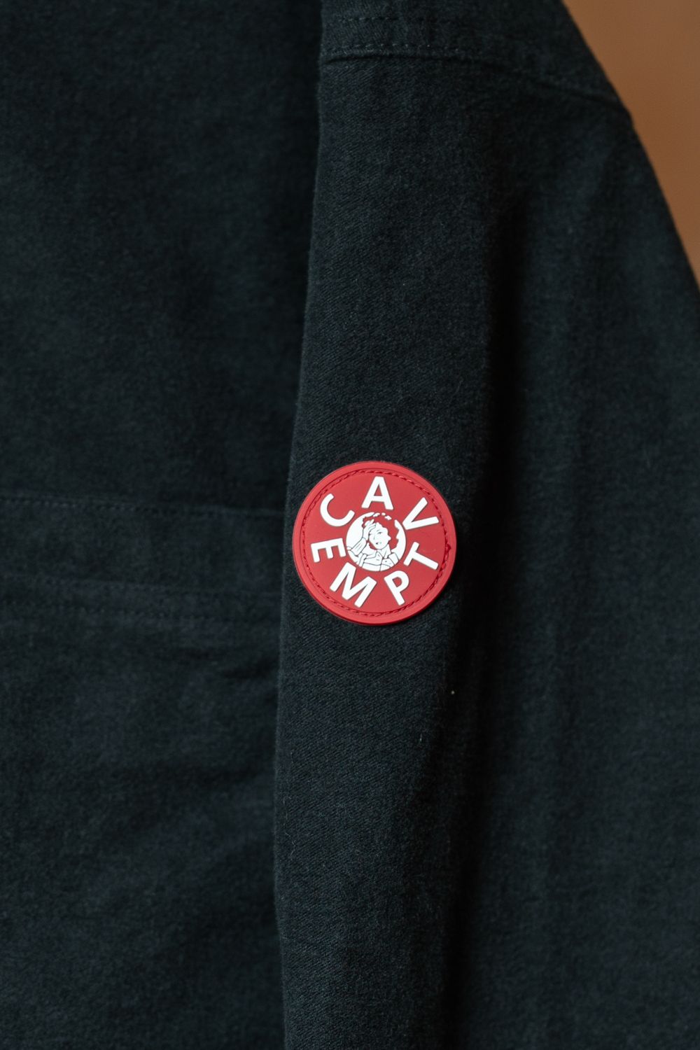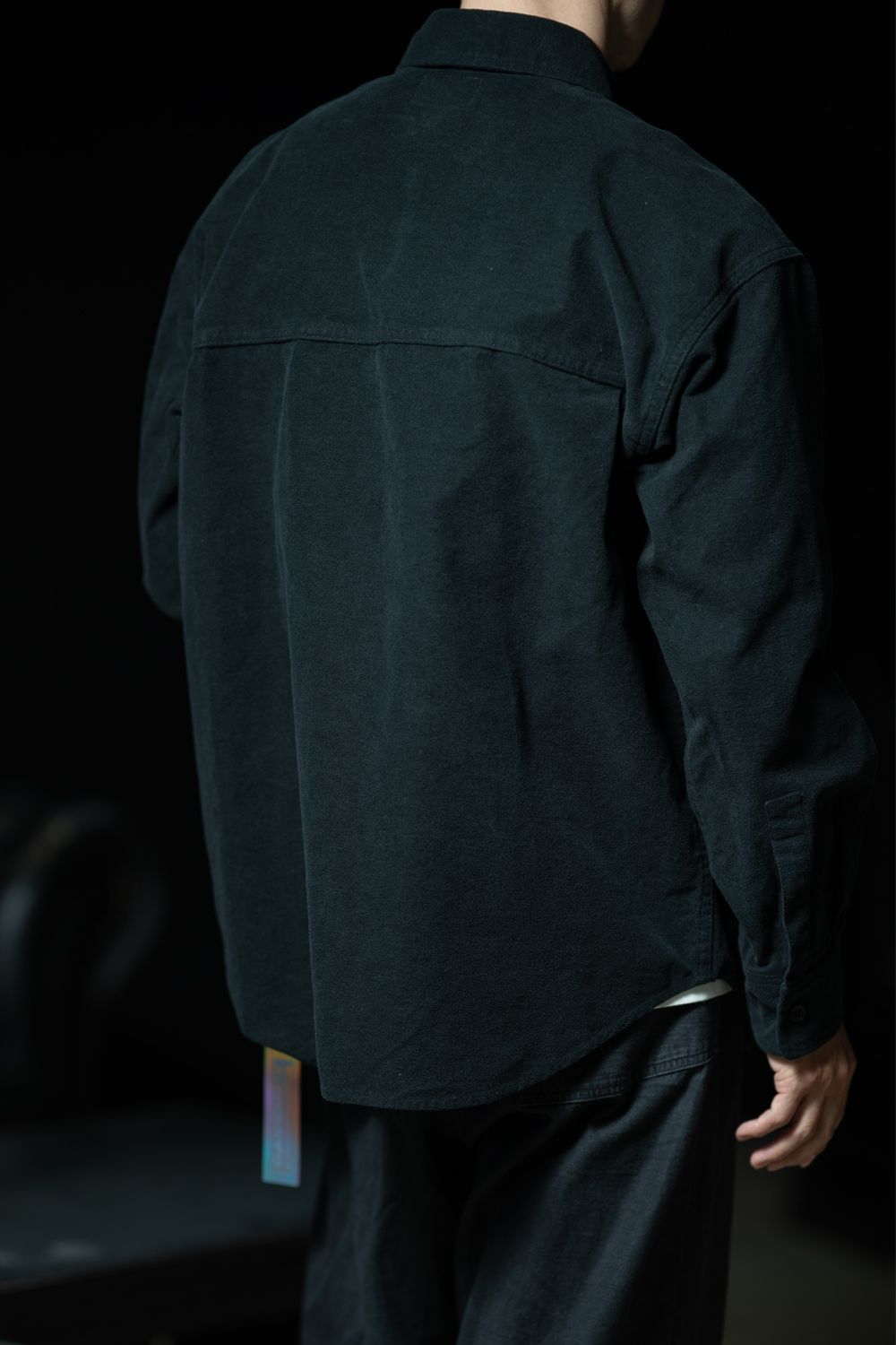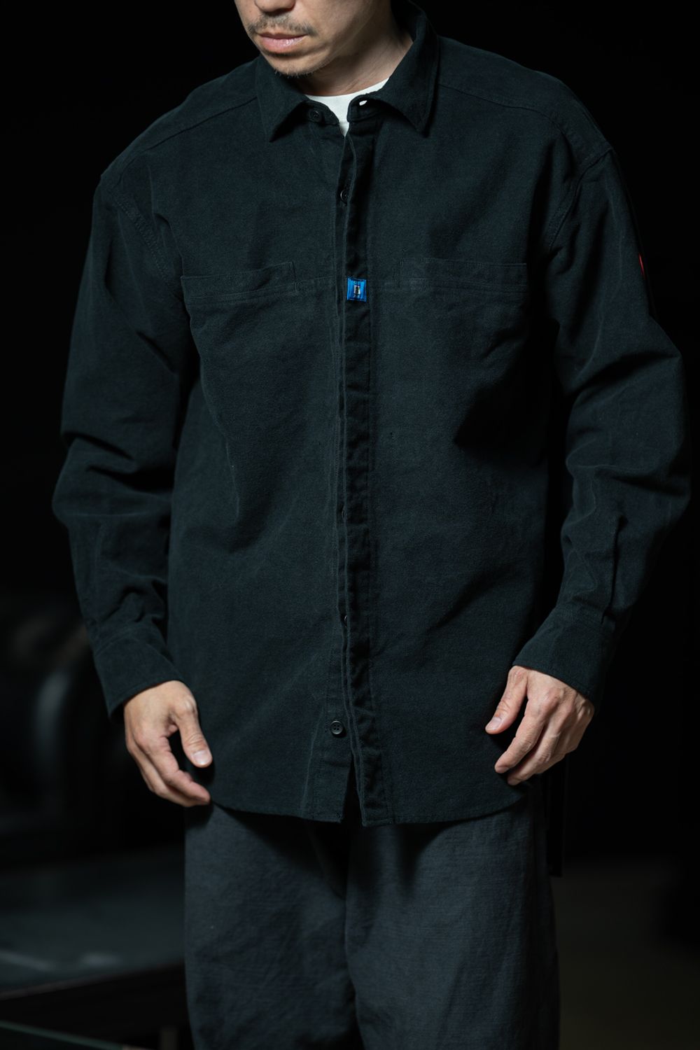 100%コットン。モールスキン生地。レギュラーポイントカラー。比翼前立。セットインスリーブ。左袖上部にシリコンパッチ。前立にピスネーム。シングルカフス。前身頃、後ろ身頃で生地切り替え。前身頃にウェルトポケット。ワイドシルエット。バイオウォッシュ加工。日本製