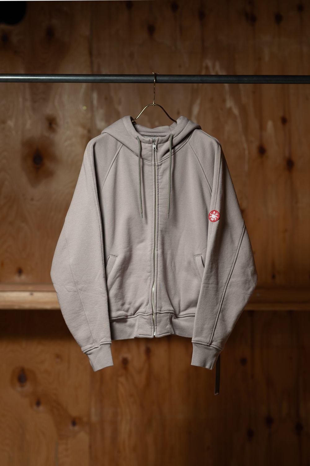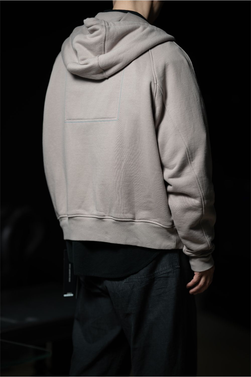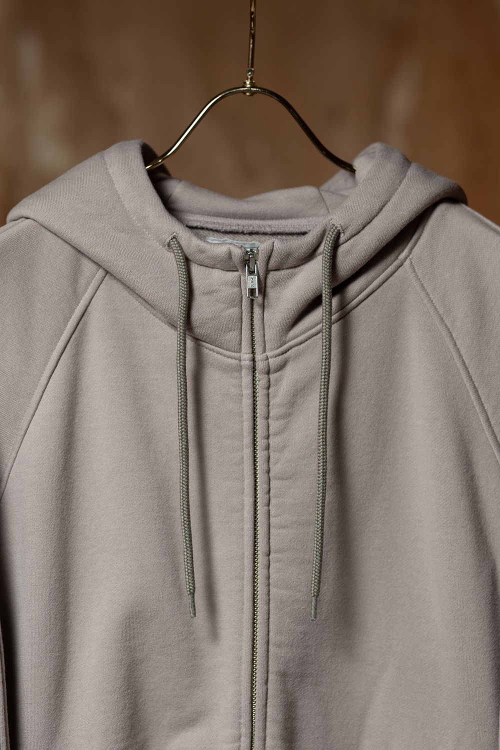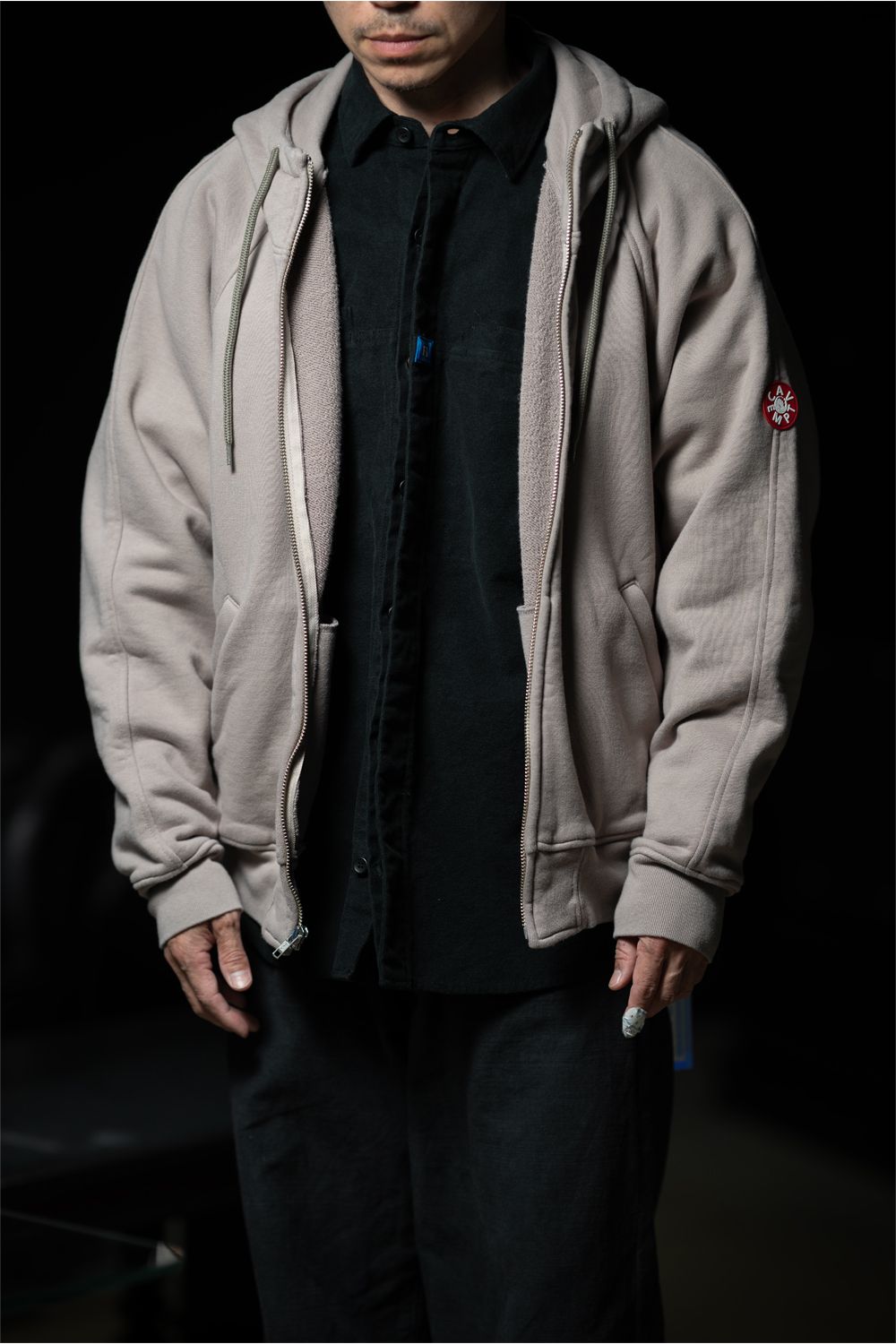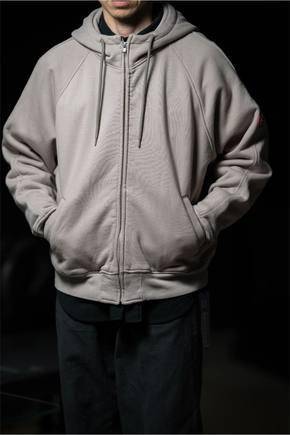 100%コットン。ジップアップ。務歯隠し。ラグランスリーブ。後ろ身頃裏に布パッチ。後ろ身頃表にリフレクタープリント。左袖上部にシリコンパッチ。前身頃にウェルトポケット。フードにドローストリング。ワイドシルエット。ウォッシュ加工。ベージュ、ブルーの2色展開。日本製。