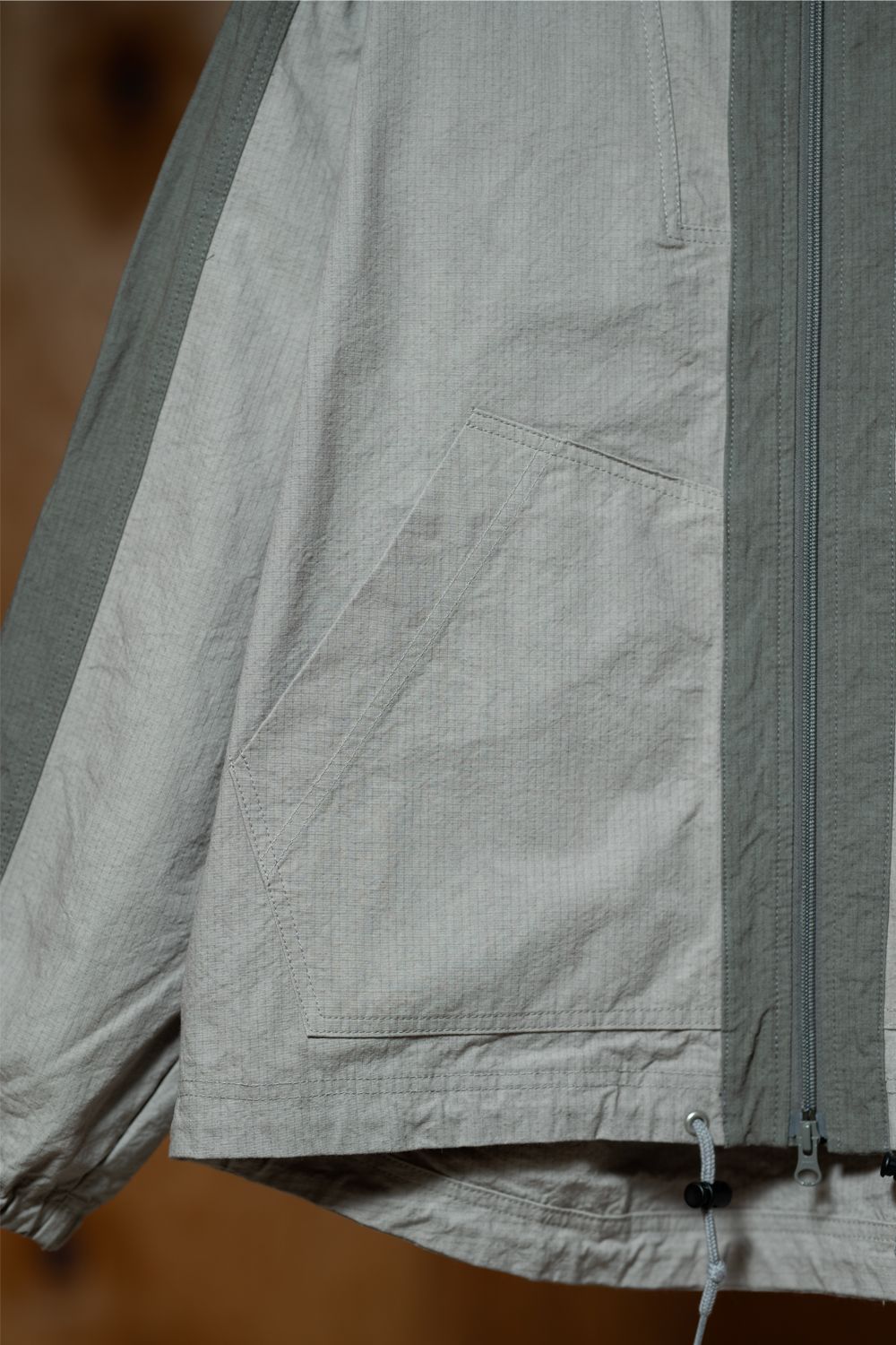 リップストップ特有の細かな格子織りが、素材の強度と表情を生み出しています。