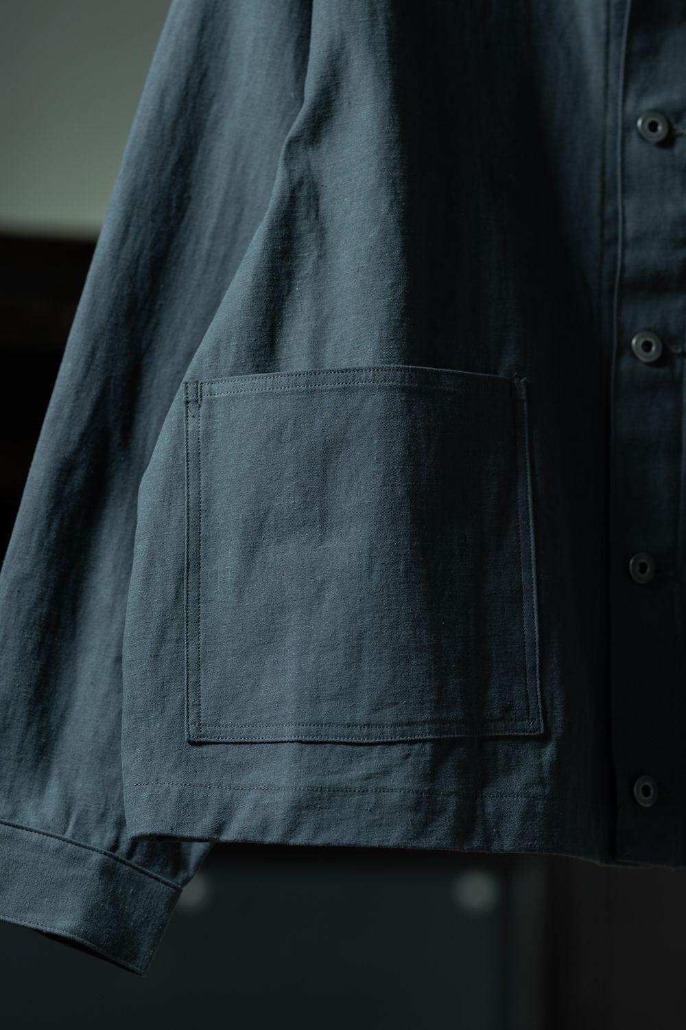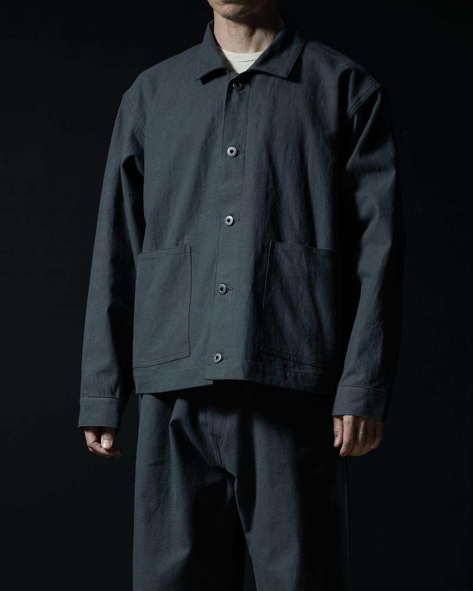 肩にはわずかに傾斜を加え、当時のワークジャケットに見られる脇下の溜まりを調整。