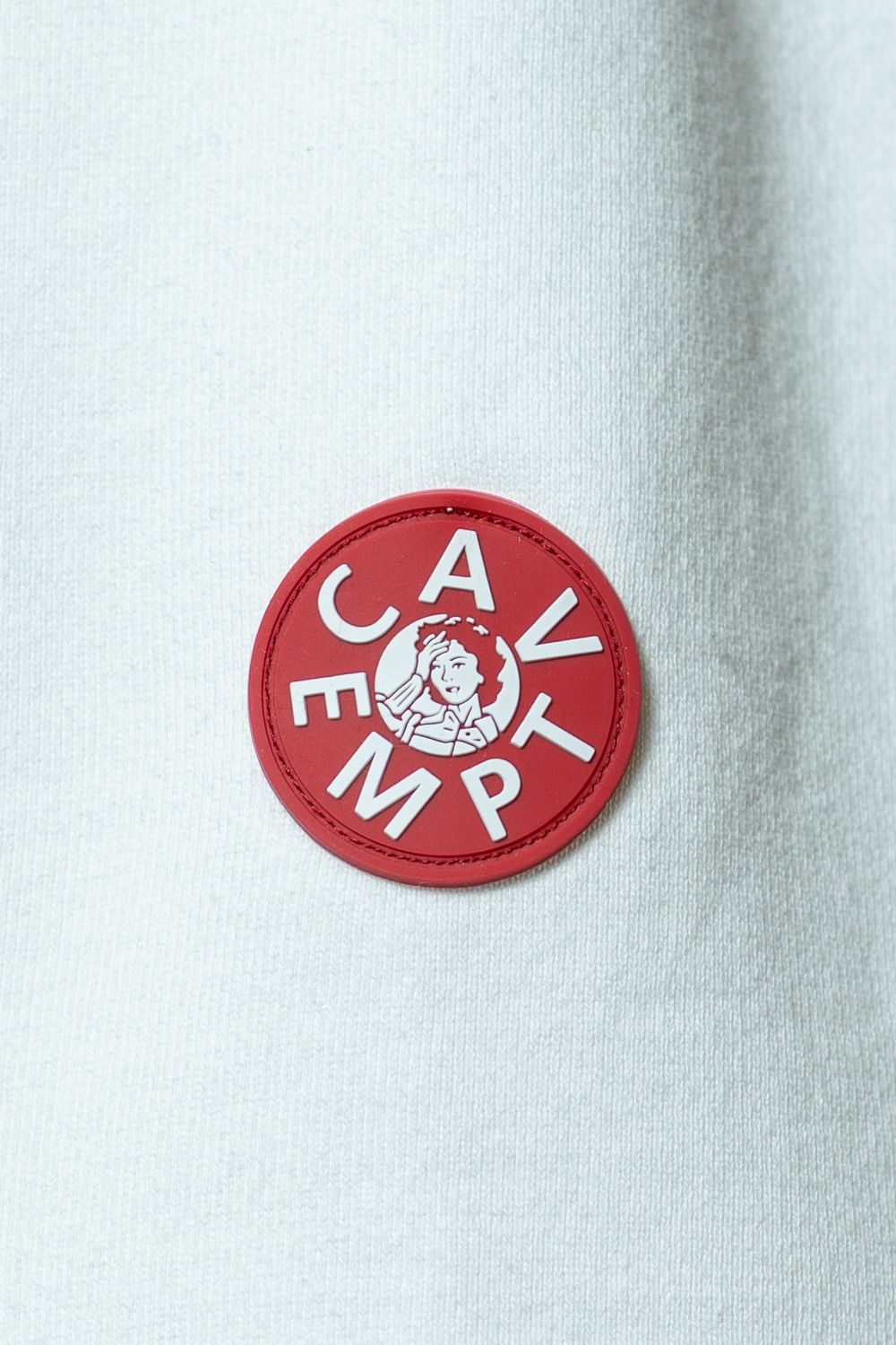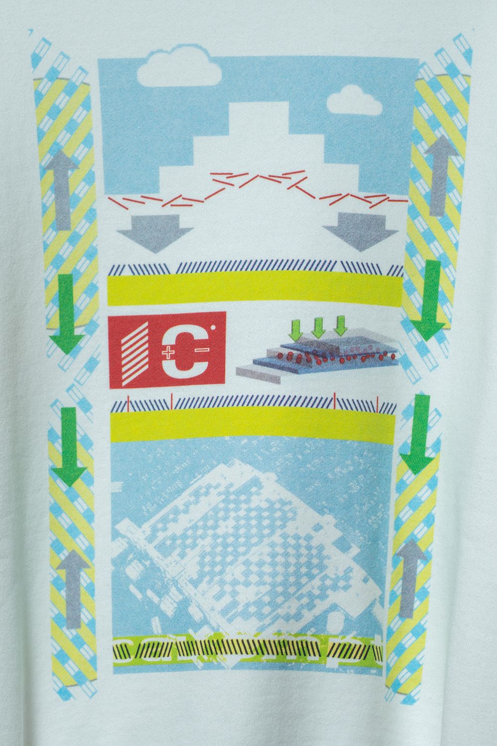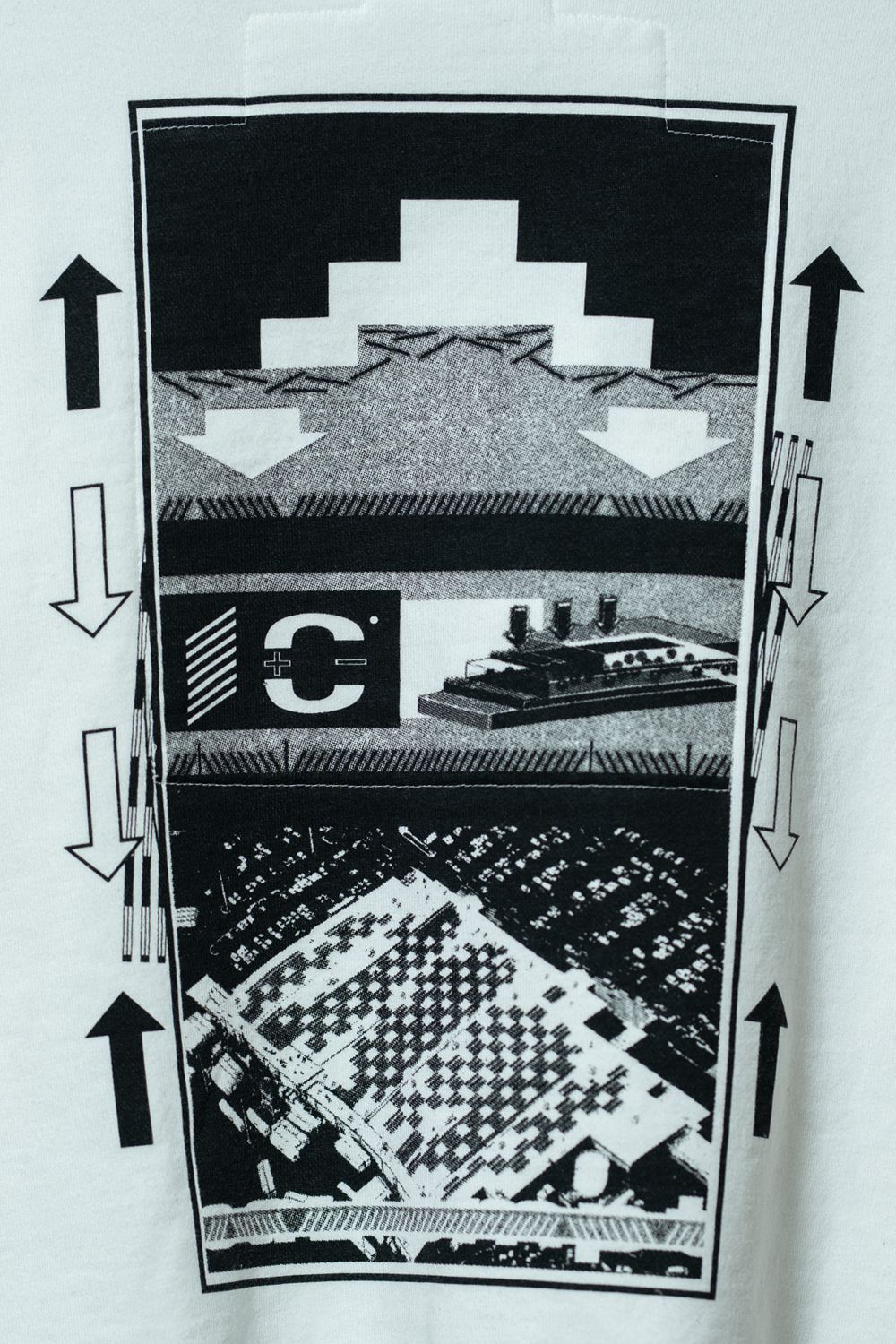 フロントと同じグラフィック構成をモノクロに落とし込んだ大判プリント。カラーとモノクロ、表と裏で全く異なる表情を持ちながら、一枚の服として完結しているのがC.Eらしい設計です。
