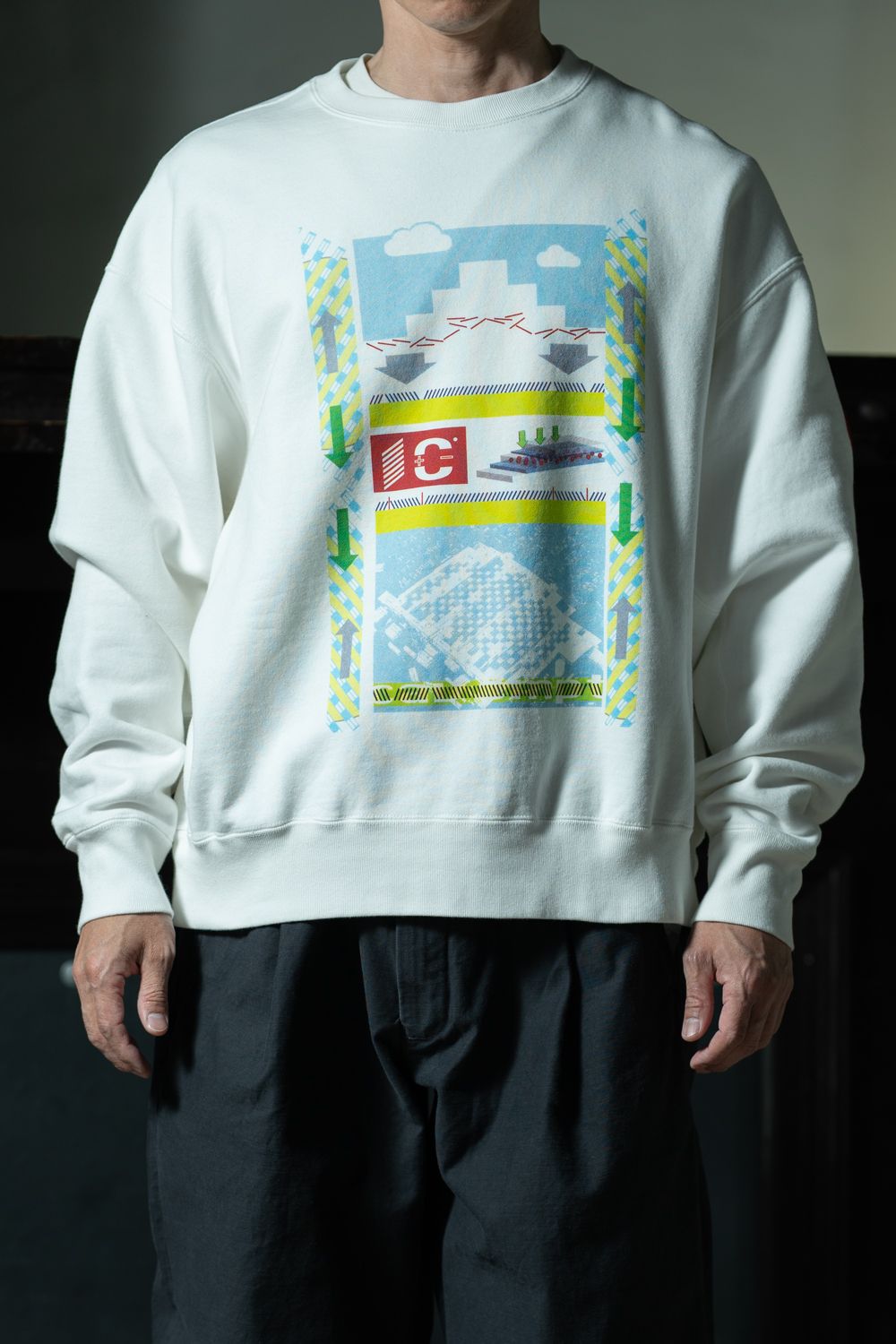 オフホワイトの生地に、カラフルで情報量の多いグラフィックが目を引きます。ウォッシュ加工による柔らかな風合いと、ワイドシルエットのバランスが絶妙です。