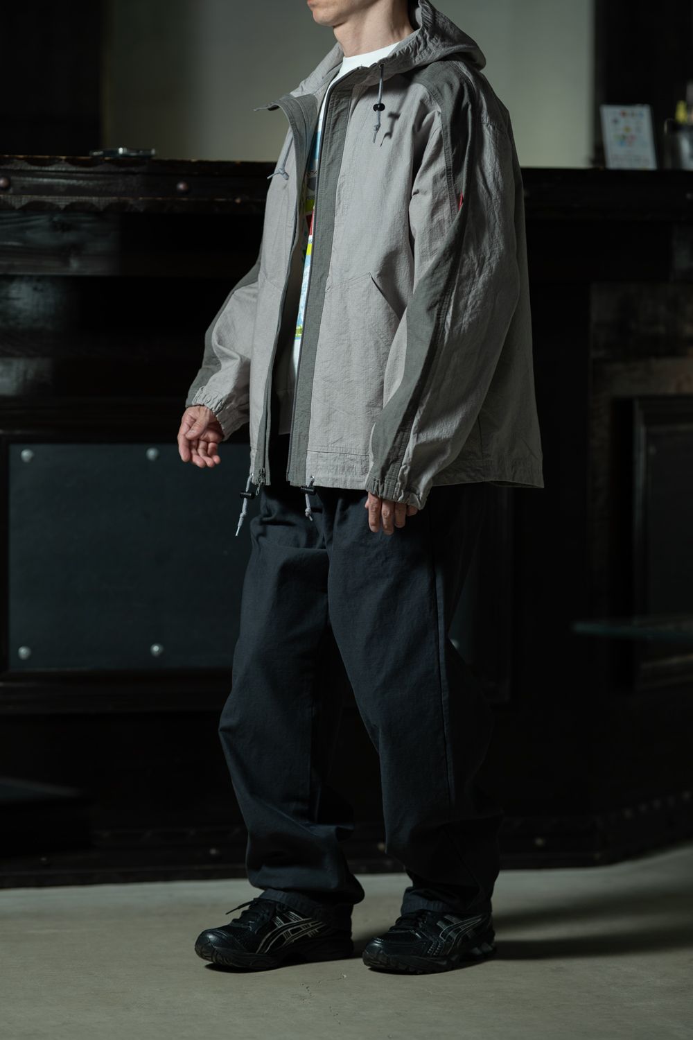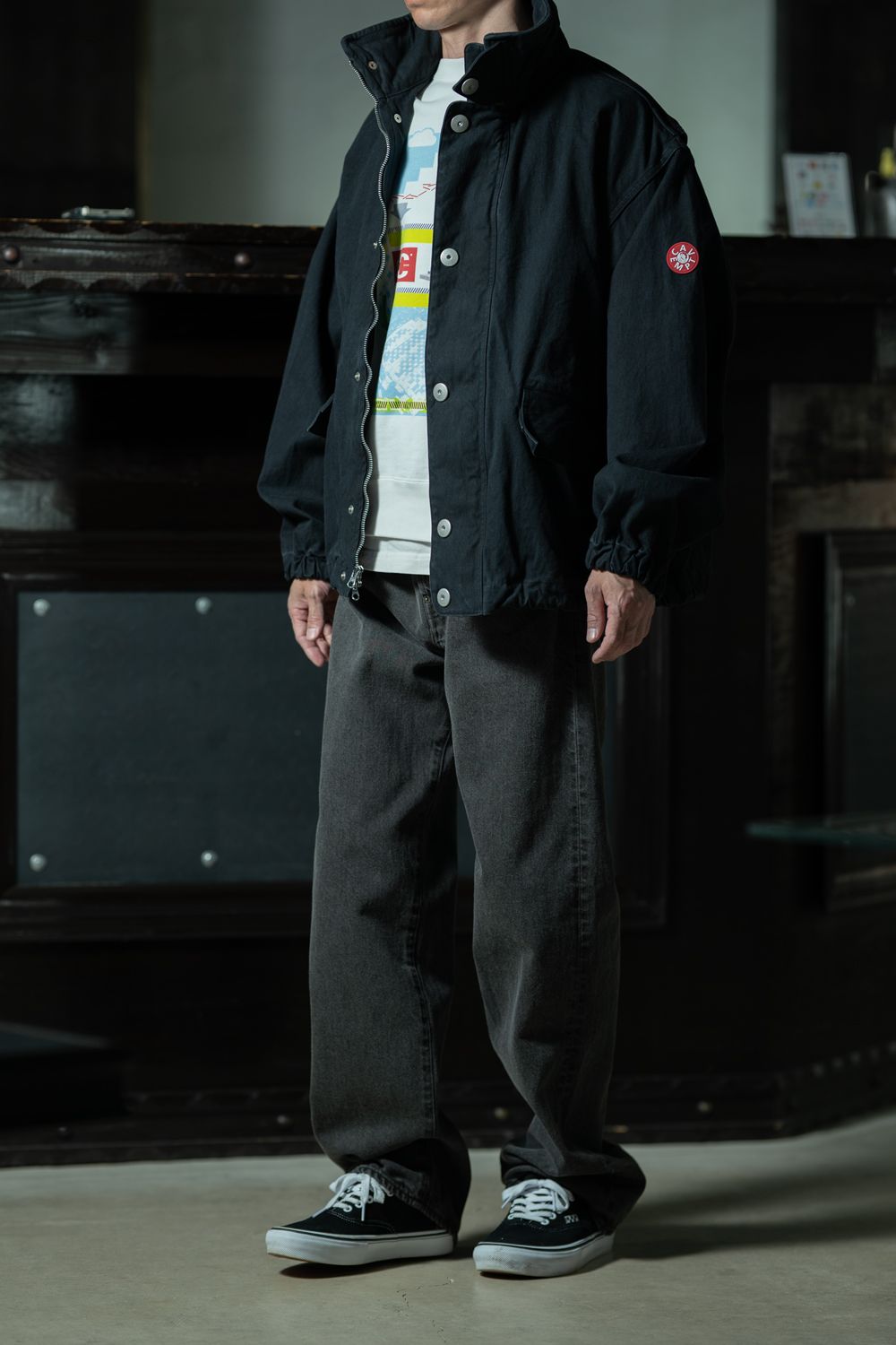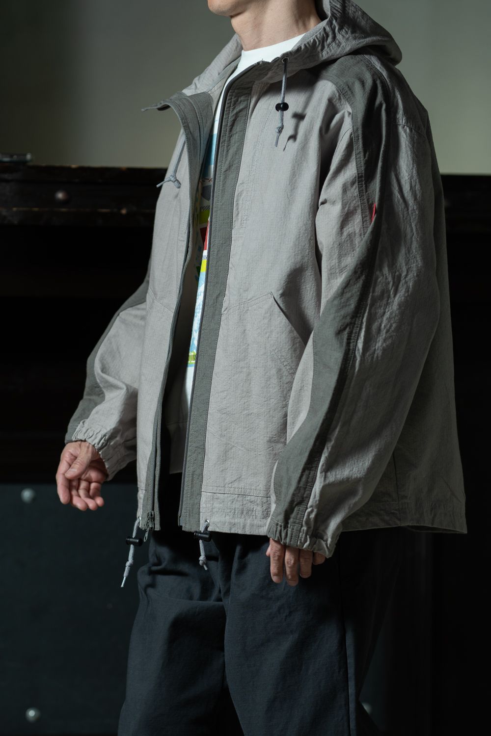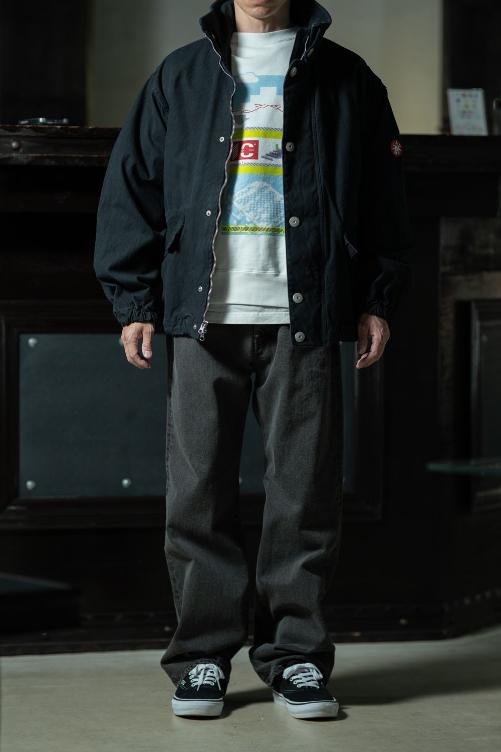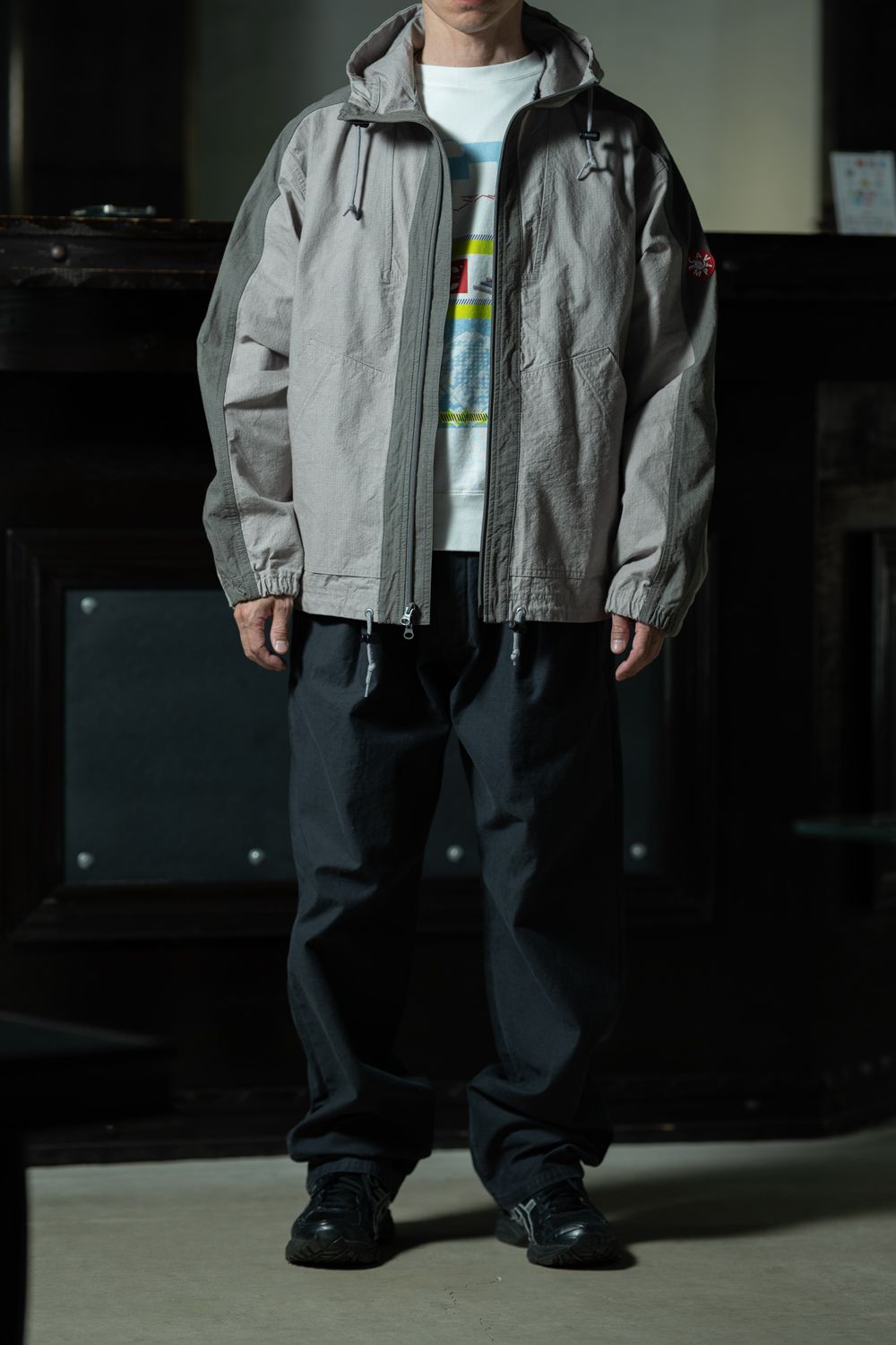 グレーのキャンバスジャケットをオープンフロントで羽織り、インナーのカラーグラフィックをあえて覗かせたスタイリング。