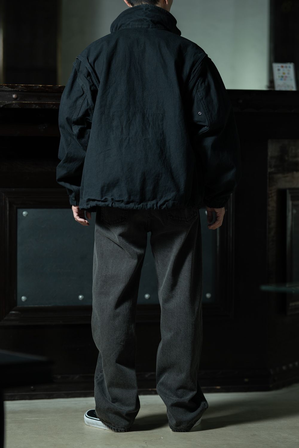 ブラックのキャンバスジャケットでスウェットをレイヤードした、最もトーンを落としたスタイリング。