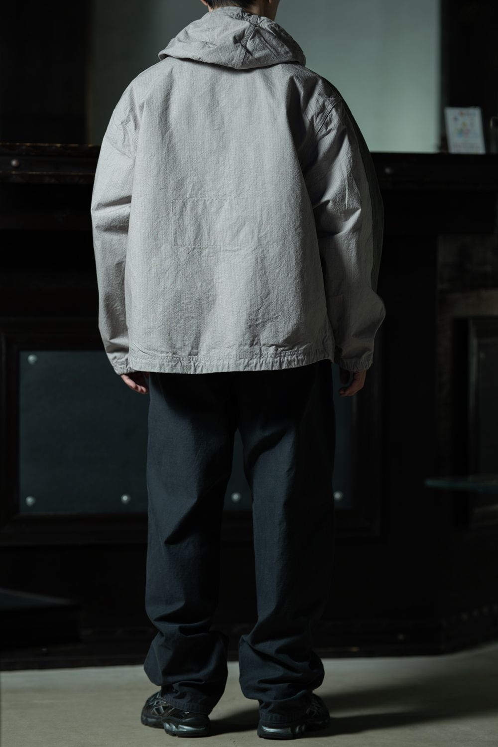 ジャケットのミニマルな背面と、スウェットのモノクロームグラフィックが重なり、コーディネート全体が引き締まった印象に。