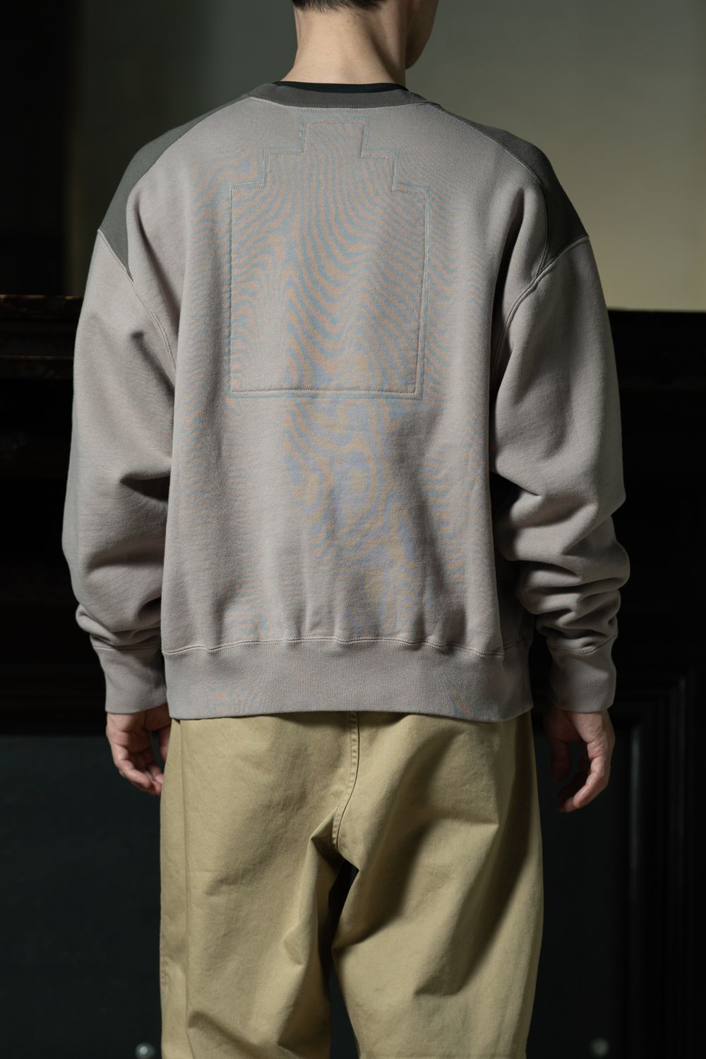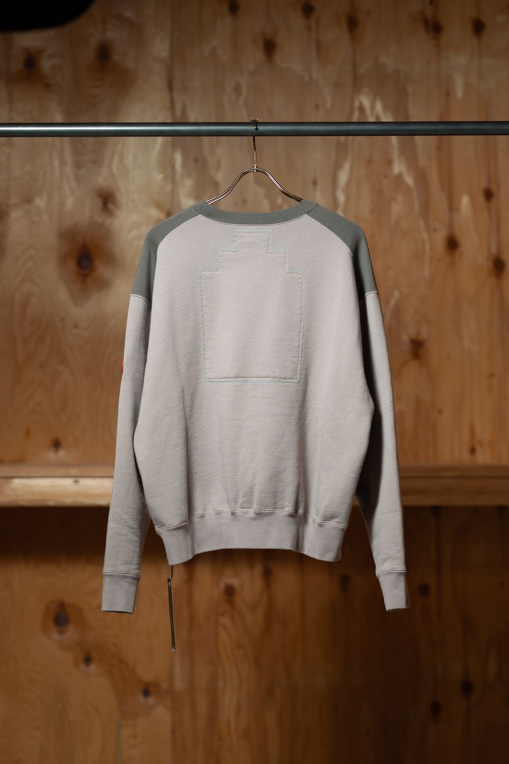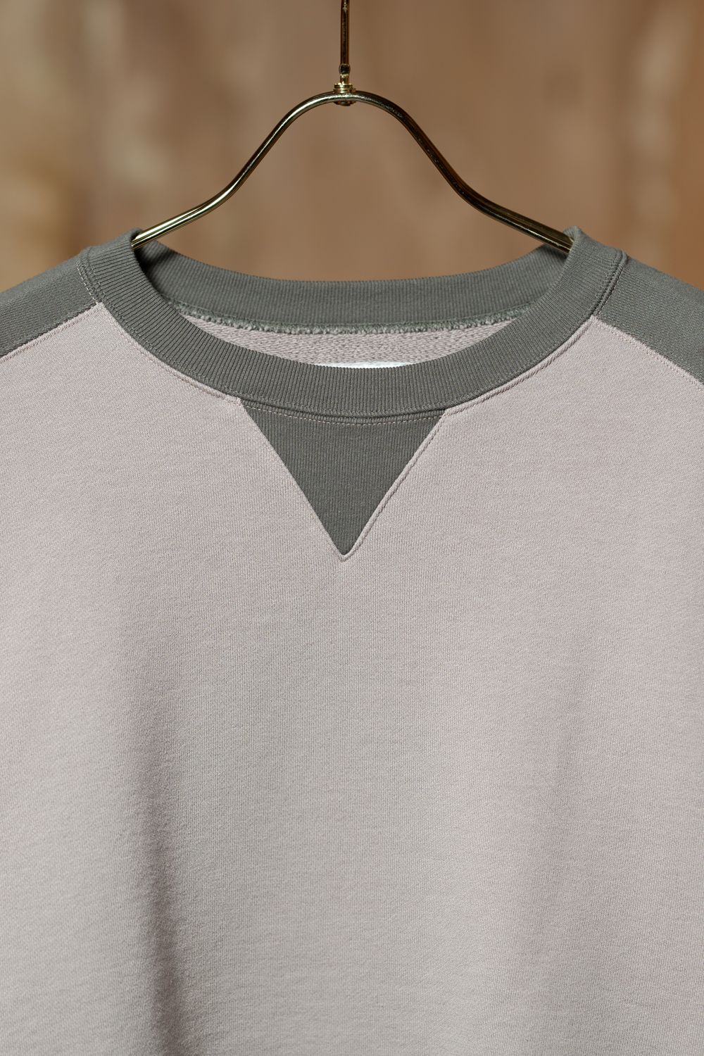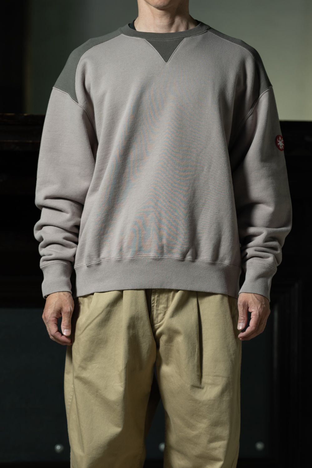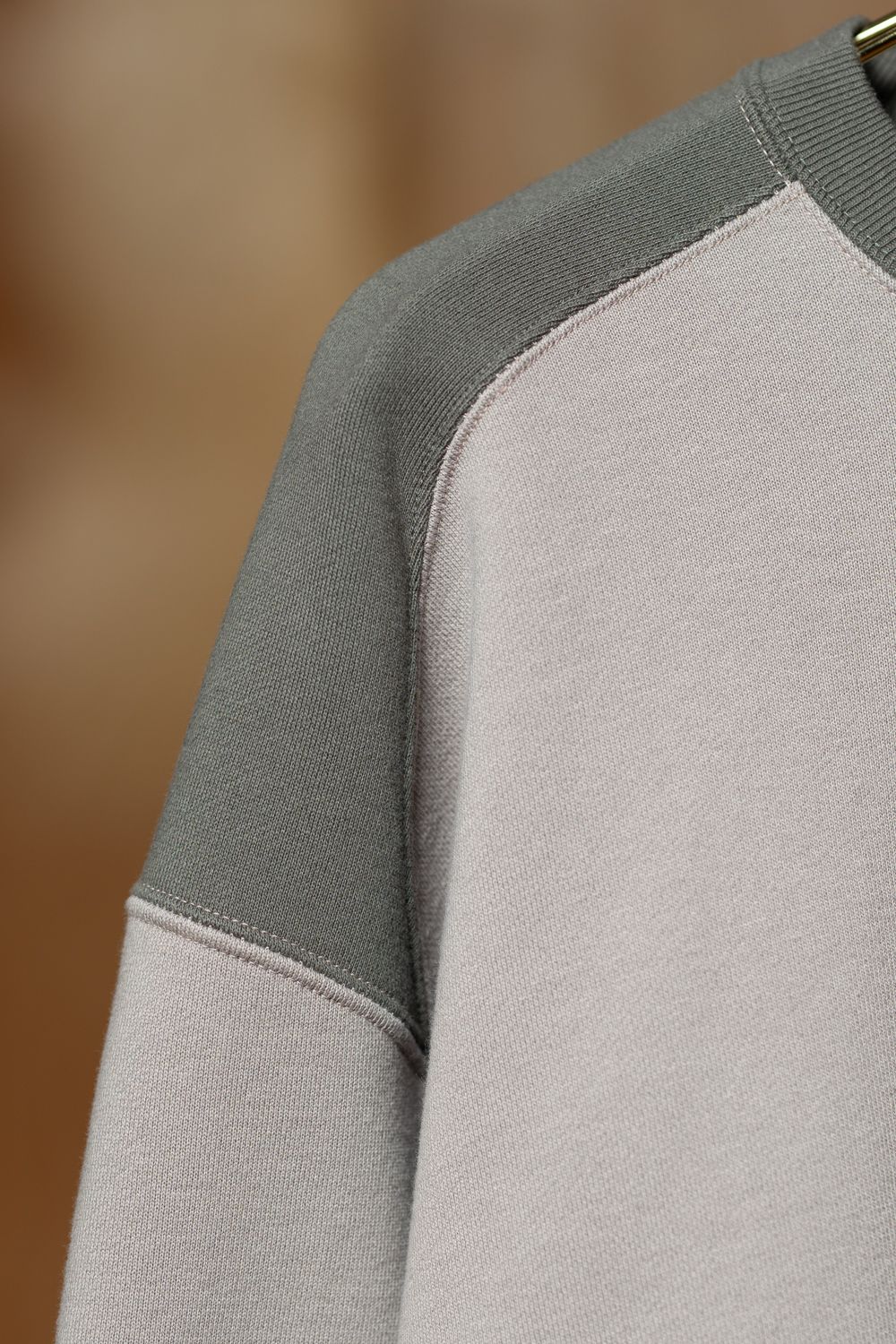 ベージュとグレーのパネル切り替えが目を引くクルーネックスウェット。