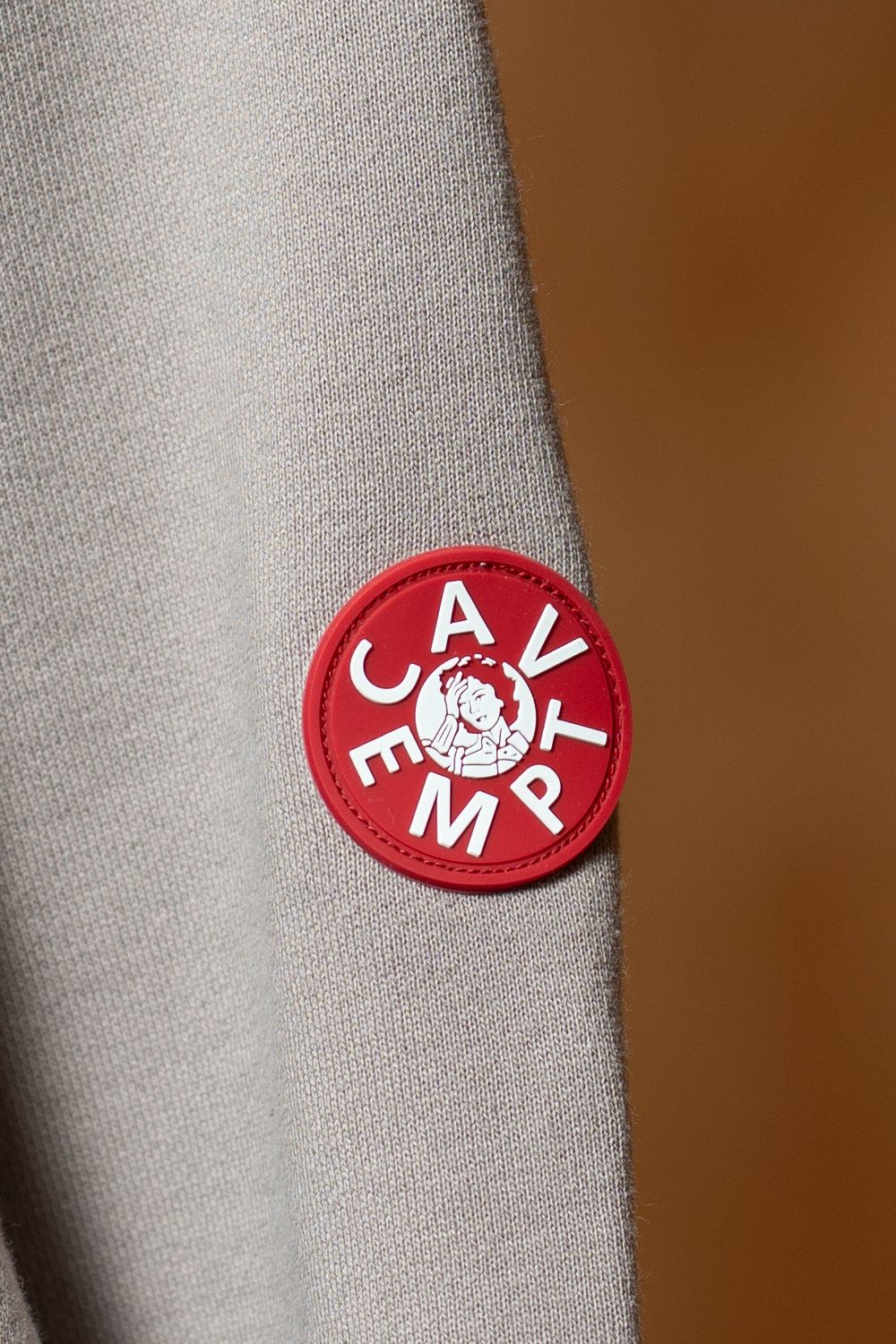 左袖上部に縫い付けられたCAV EMPTのラウンドシリコンパッチ。ブランドを知る人には伝わる、控えめでありながら確かな存在感を放ちます。