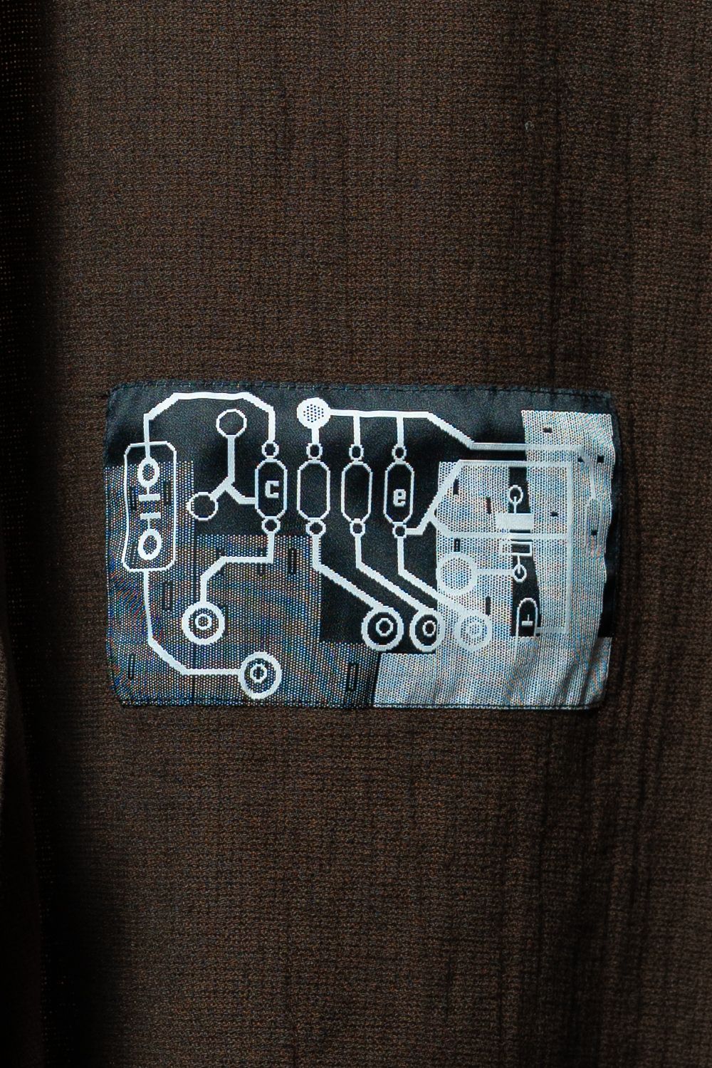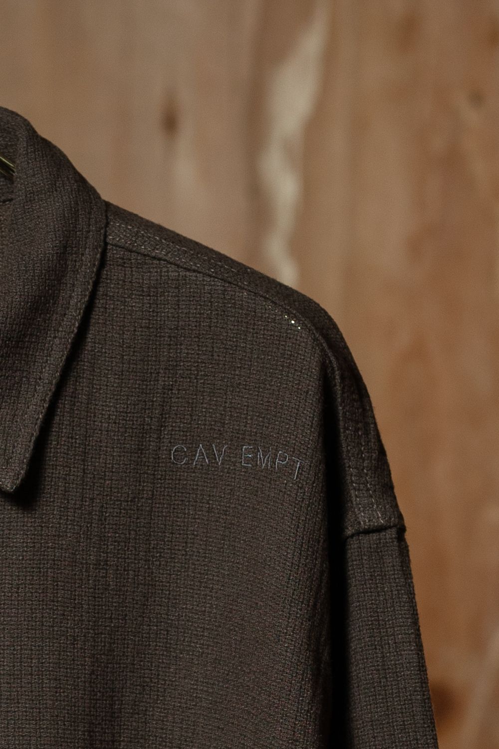 レギュラーポイントカラーにYKKのシルバージップ。前身頃のショルダーにはCAV EMPTの刺繍、後ろ身頃の裏にはサーキットボードのようなグラフィックパッチが縫い付けられている。左袖上部には赤いシリコンパッチ。袖口にはボタン留め。ウェルトポケットは縫い目が生地に溶け込むようにステッチされ、主張せずに機能する。