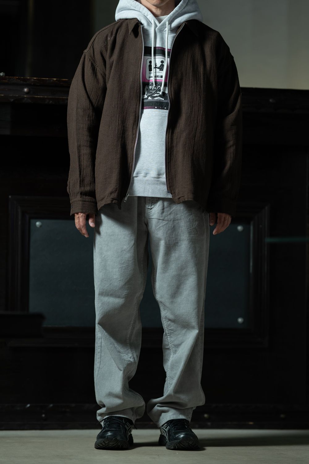 ボトムはオーバーダイウォッシュのグレーコーデュロイ。ウェールの細かい陰影が光の当たり方で表情を変える。全身C.Eで統一しながら、ウォッシュリネン×スウェットパーカー×コーデュロイという三素材のテクスチャーが積み重なる。