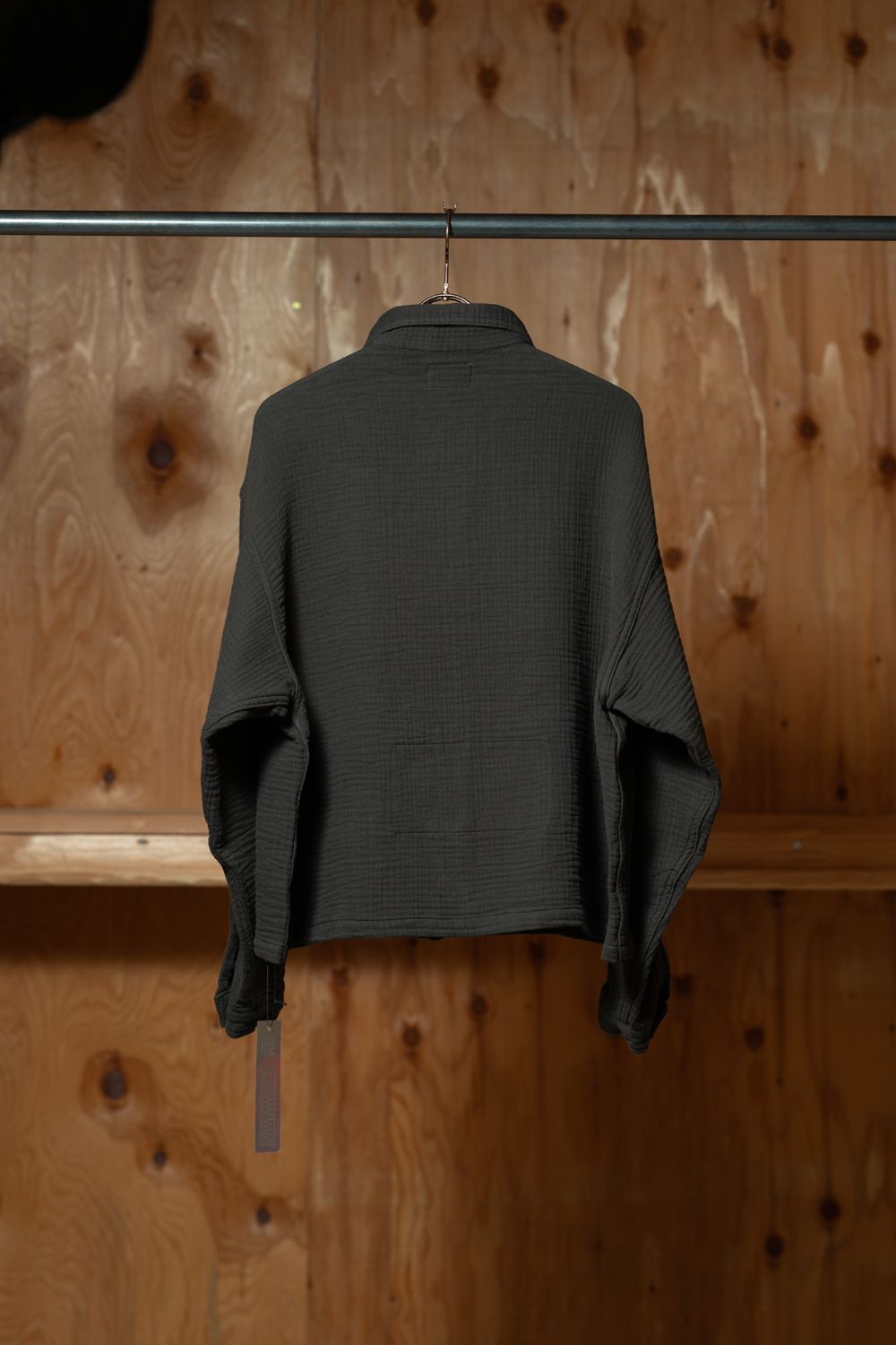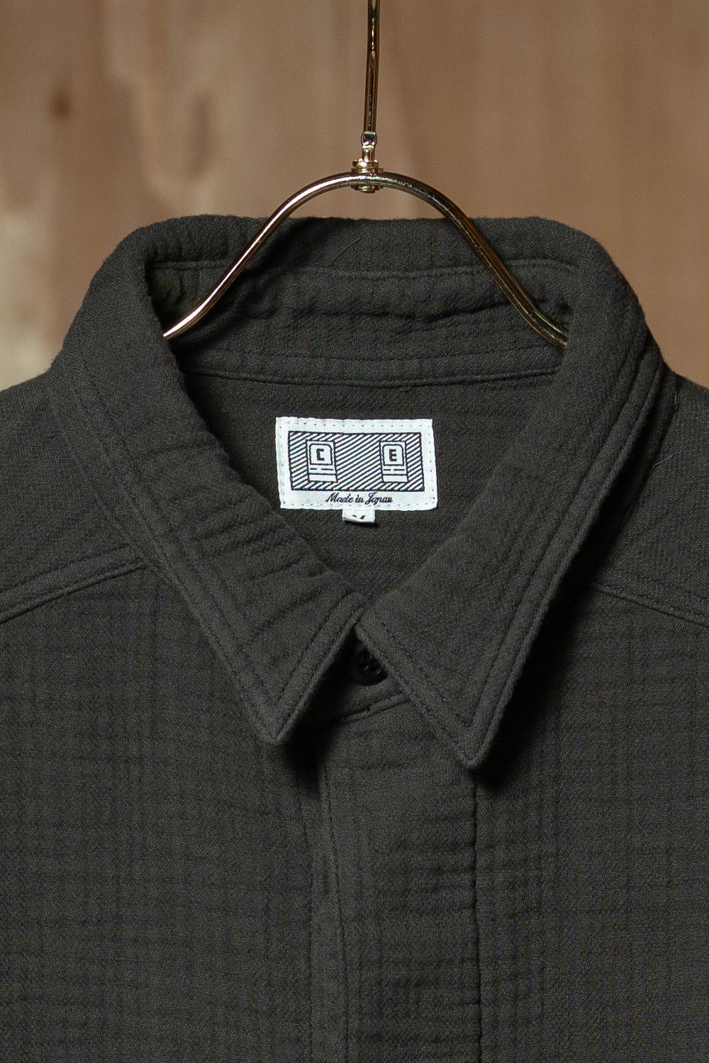 前立てはボタンが隠れる比翼仕様になっていて、前から見たときのすっきり感があります。右胸にパッチポケット、左袖にはシリコンパッチ。ウォッシュがかかっているので、最初から柔らかく着られます。着丈は短め。日本製です。
