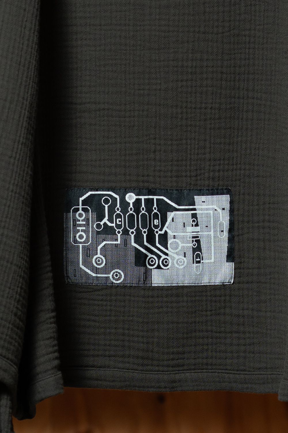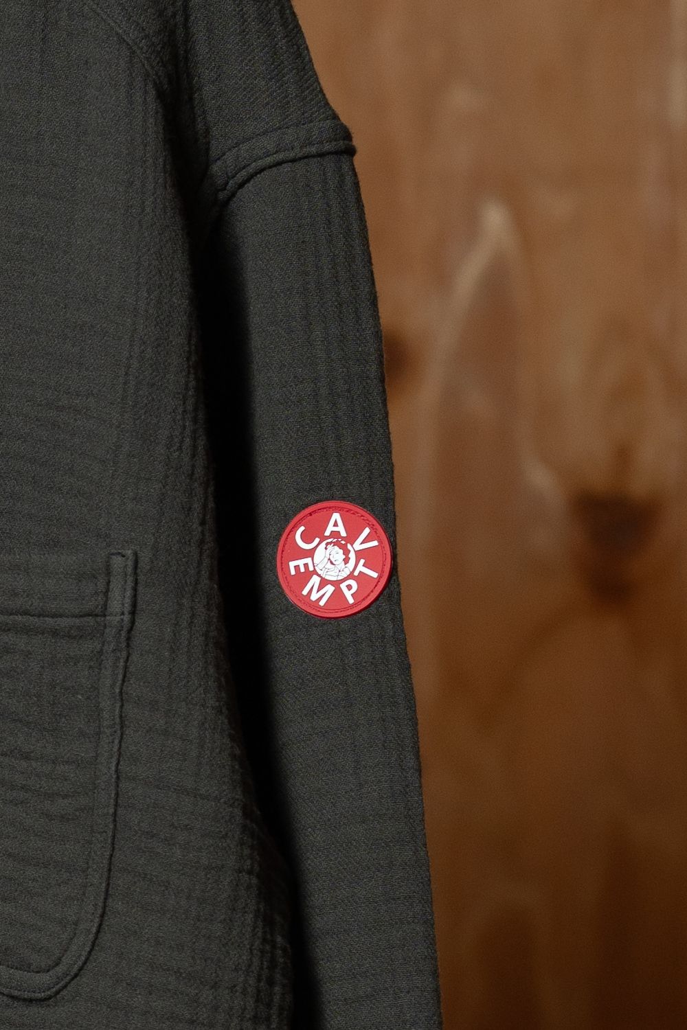 左袖のCAV EMPTシリコンパッチ。ガーゼのマットな生地に赤が映えます。