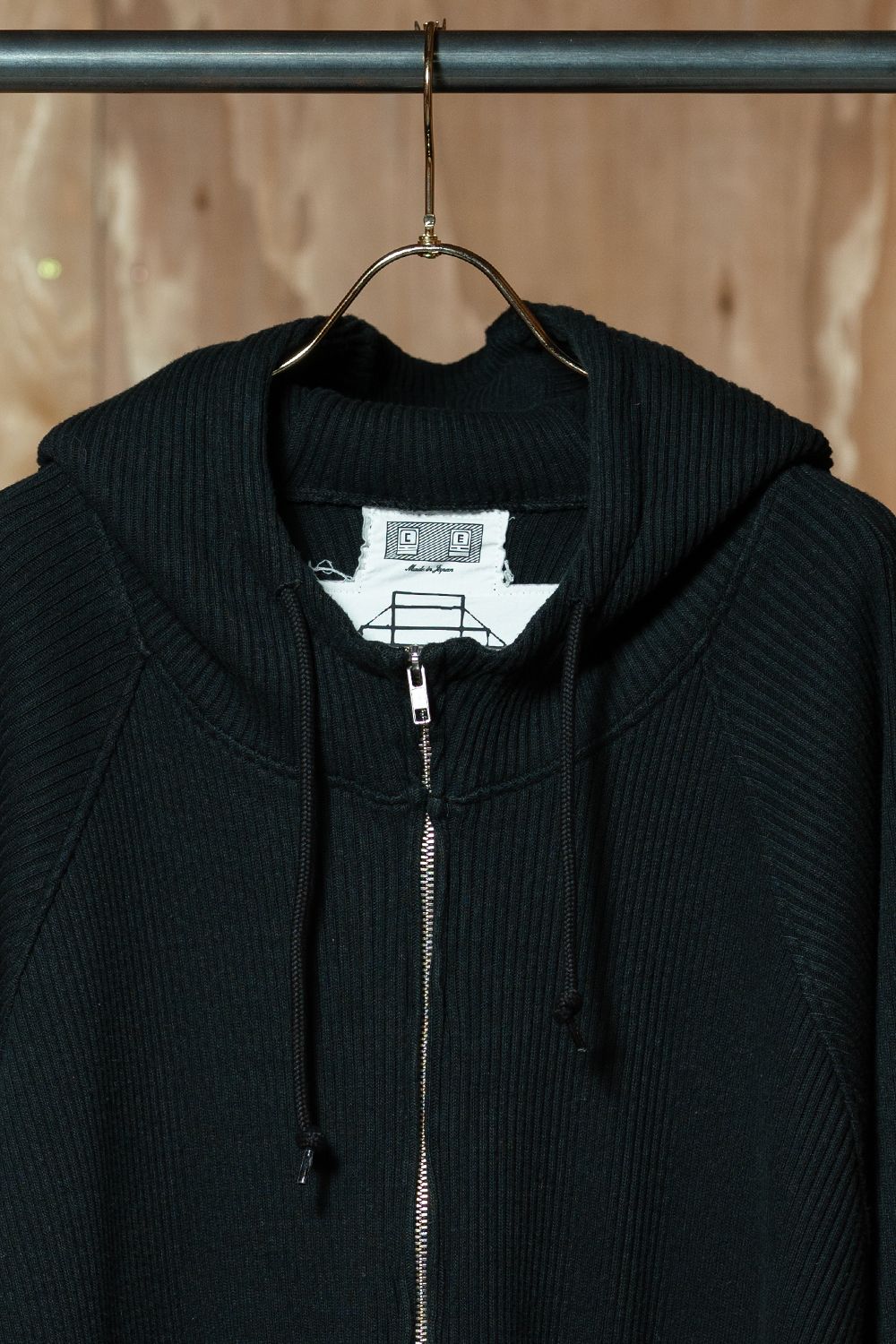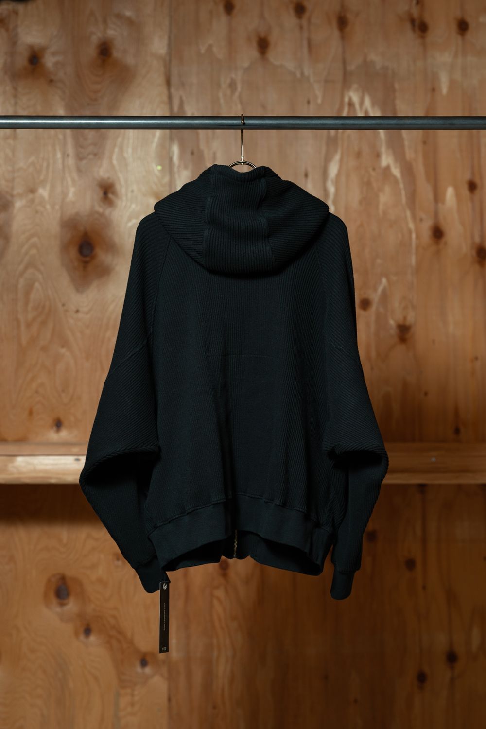 普通のパーカーと何が違うかというと、まず生地の密度がまったく違う。太畦のリブ組織がしっかりとした厚みを持っている。オーバーダイウォッシュをかけているから表面に微妙なムラが出ていて、新品なのに古着まではいかないような良い感じの風合い。