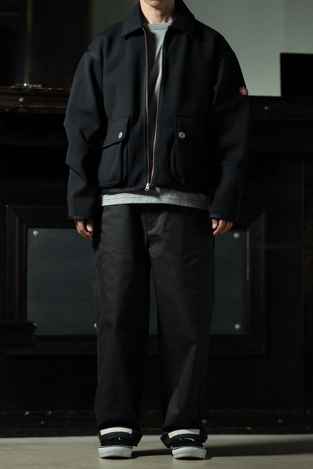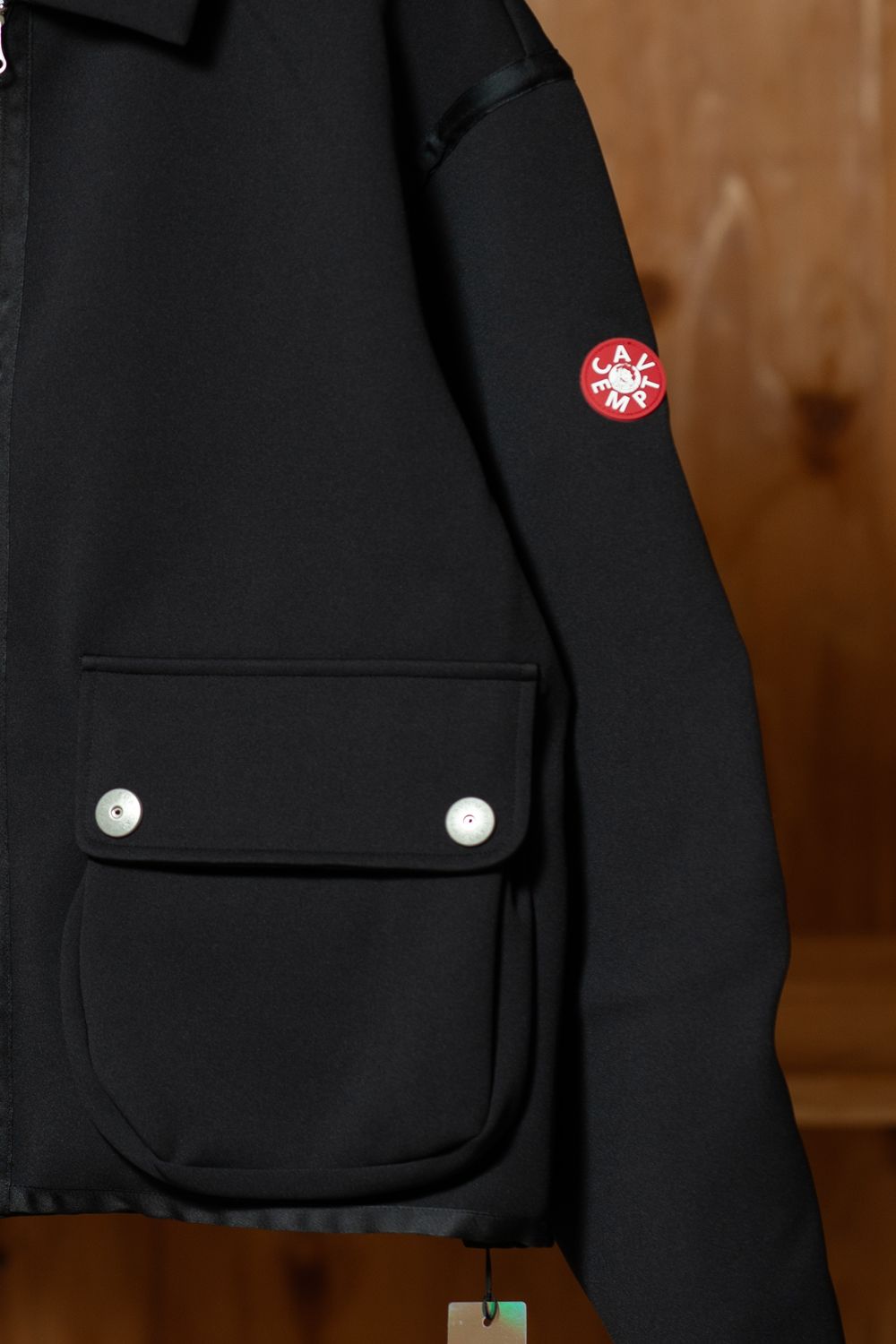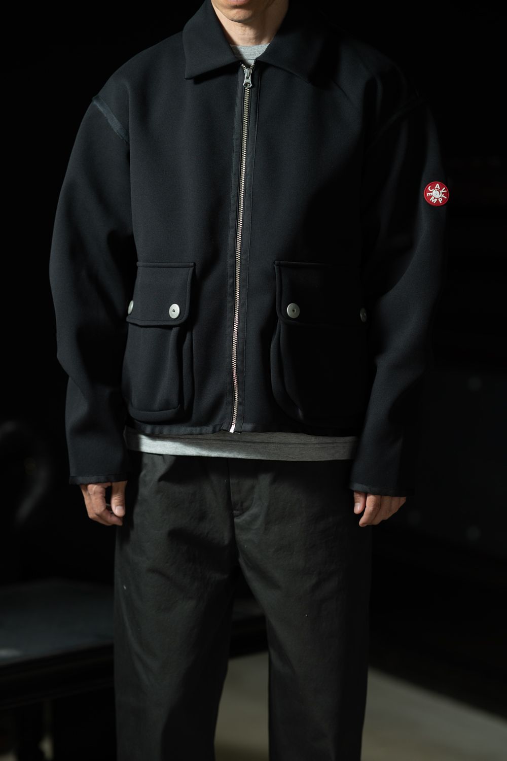 左袖にはCAV EMPTのシリコンパッチ、前身頃には大きめのパッチポケットが2つ。ポケットの蓋を留める金属スナップボタンが、工業製品的なムードを添えている。