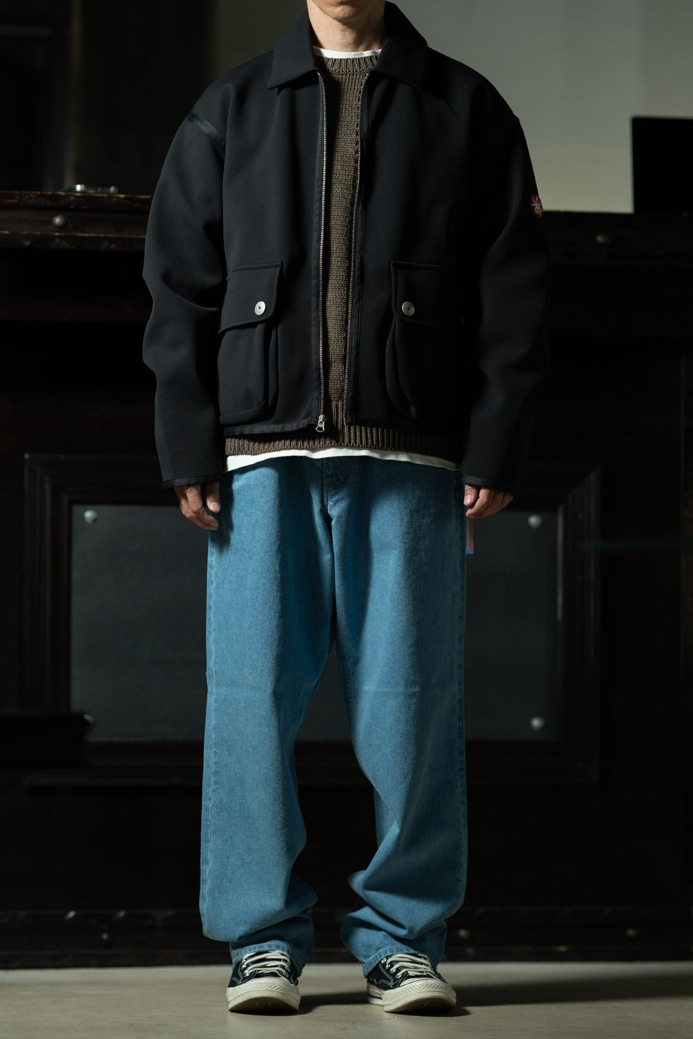 ジャケットのジップを閉めても、ニットのリブ裾がジャケットの下からのぞく。この3層の重なりが全体に立体感を生む。上2つのコーデが無彩色で固めているのに対して、このコーデはインディゴの青みが入る。同じジャケット1枚なのに、全然違う顔になる。