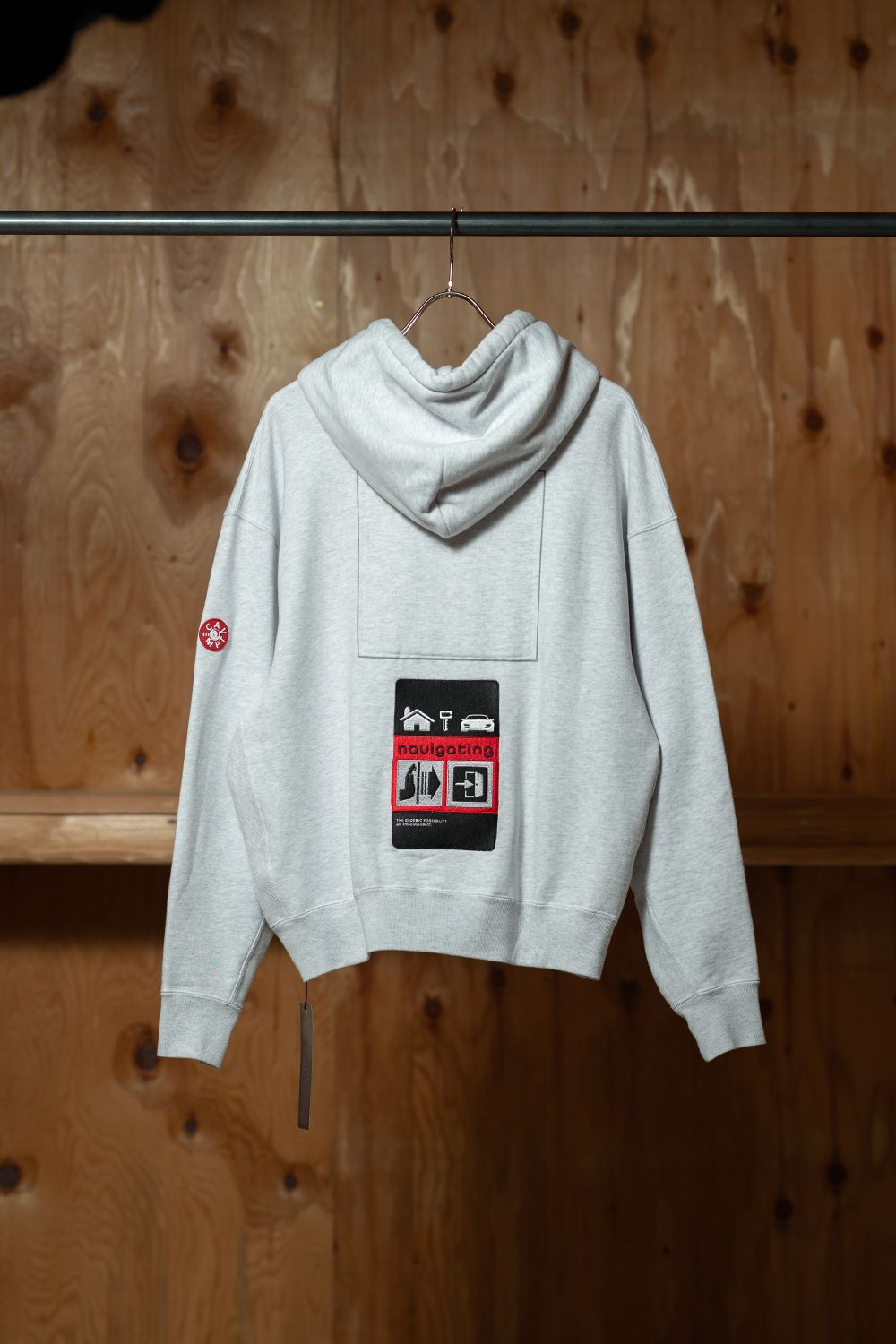 AS TrackNAV HOODYは、グラフィックパッチが前後に仕込まれていて、着るだけで画になる。ただそれだけじゃなくて、ウォッシュ加工されたコットンスウェットの素材感や、ラグランスリーブのシルエットも含めて、C.Eらしい完成度がある一枚だと思う。