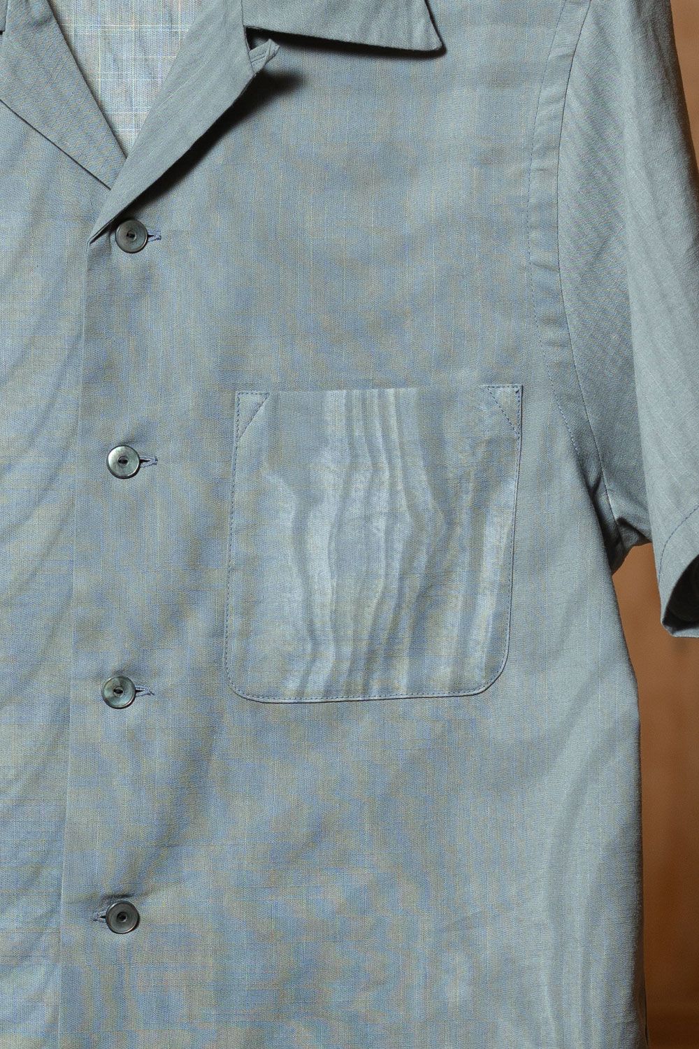 衿は1950年代のアメリカ製イタリアンカラーシャツをベースにしている。今のオープンカラーシャツの多くとは開き方が違って、もう少し構築的というか、面として成立している衿の形をしている。着たときに胸元が自然に決まりやすいのはこの衿の設計のおかげで、普段オープンカラーが苦手という人でも着やすいと思う。