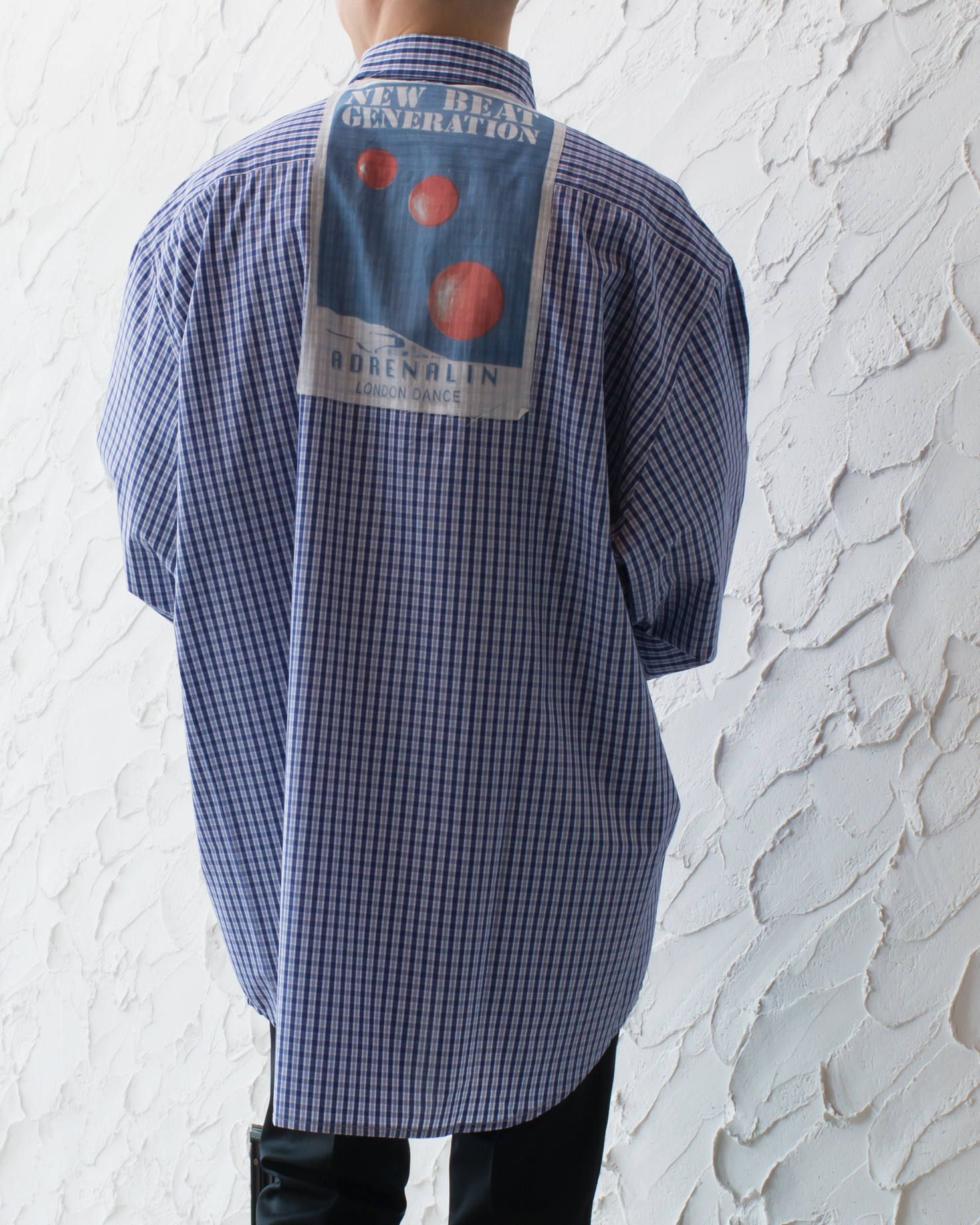 どことなく90年代に流行ったような絶妙なチェック柄のユルめなシルエットのシャツ。意味がありそうな布パッチデザインが特徴的。イベントのフライヤーのような背面のパッチには「ニュービートジェネレーション アドレナリン ロンドンダンス」。着ているだけで楽しくなりそうなシャツです。