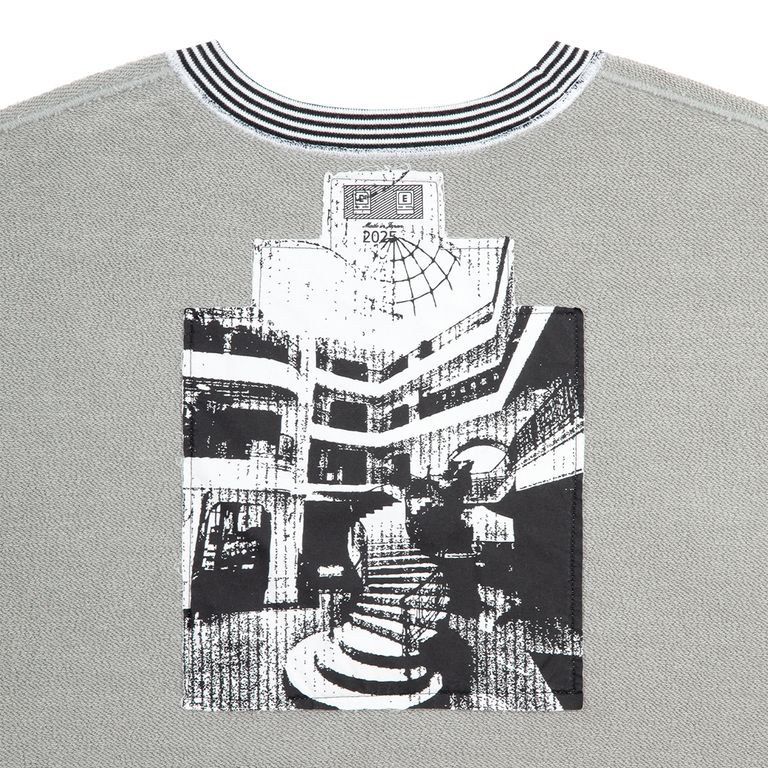 100%コットン。スウェット生地。プルオーバー。クルーネック。セットインスリーブ。後ろ身頃裏に布パッチ。後ろ身頃表にリフレクタープリント。左袖上部にシリコンパッチ。襟、袖口、裾にストライプリブ。袖下、脇で生地切り替え。ワイドシルエット。ウォッシュ加工。日本製。